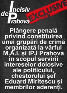 In articolele anterioare va dezvaluiam situatia împuternicirilor din cele mai importante structuri din IPJ Prahova efectuate cu sprijinul si la ordinul chestorului Eduard Mirițescu in vederea constituirii unei grupari de crima organizata chiar in interiorul M.A.I. pentru a servi intereselor dolosive ale politicului, intereselor dolosive ale lui Eduard Miritescu si a membrilor care au aderat pe parcurs la acesta grupare.