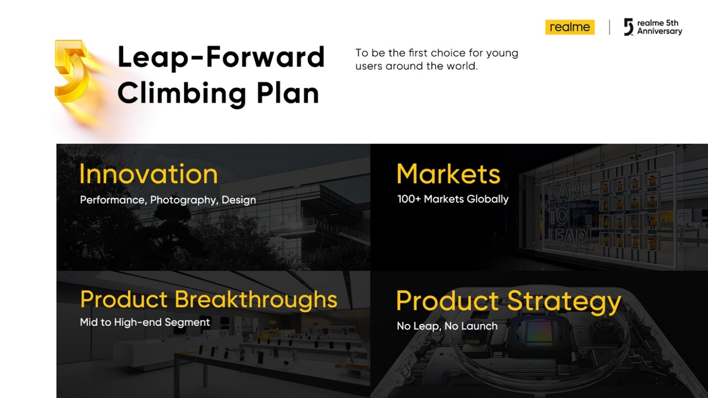 După 5 ani de la înființare și după s-a confruntat cu un mediu dificil, realme Europe a lansat „Leap-Forward Climbing Plan” și 4 inițiative pentru a-și susține obiectivul de a deveni prima alegere pentru tinerii utilizatori din întreaga lume: