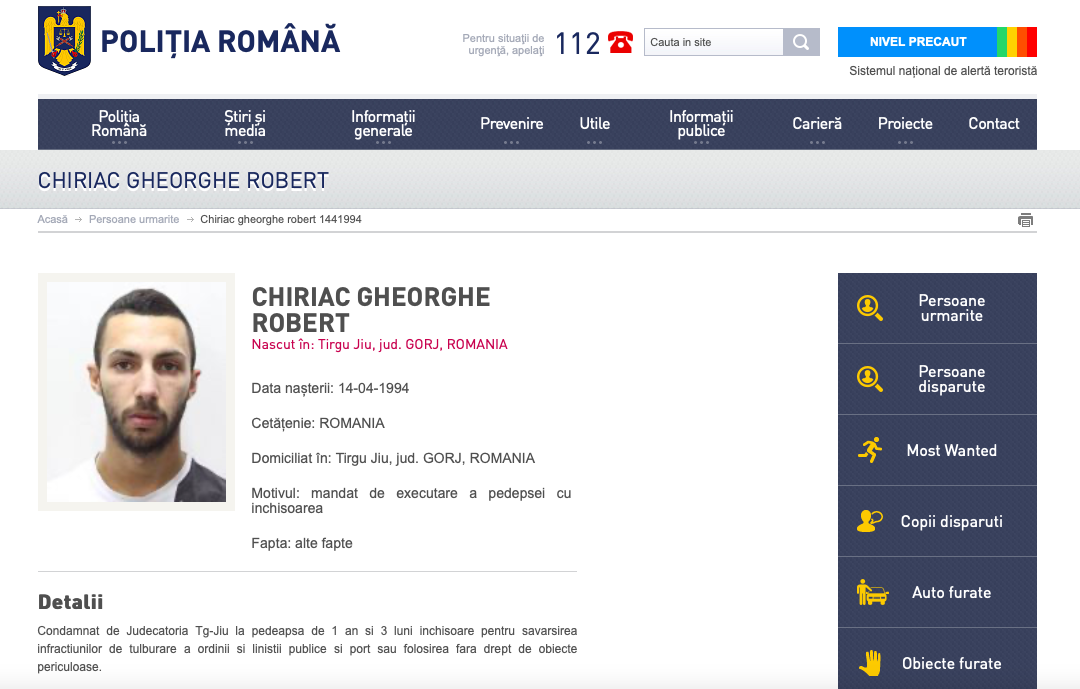Mai jos puteți consulta fotografia şi detaliile sentinţei de condamnare de pe site-ul Poliţiei Române, acesta figurând ca persoană dată în urmărire naţională şi internațională.