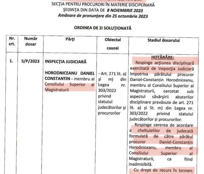 Ulterior, Inspecția Judiciară s-a autosesizat în acest caz, însă acțiuneaa disciplinară inițiată de împotriva lui Horodniceanu a fost respinsă acum de Secția pentru procurori a CSM.