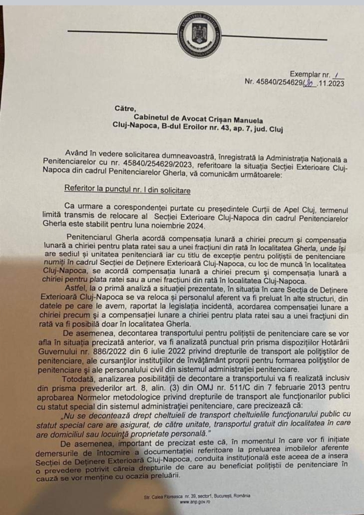 Am văzut ca în țară toate penitenciarele au activități care mai de care cu deținuții: de la mers la meciuri cu ei, la făcut pâine si/sau ca in cazul de la Ploiesti, la deseuri periculoase. Ce părere aveți despre desființarea unui loc de deținere? Mai există în România și în Uniunea Europeană legislație pentru așa ceva? Este vorba despre desființarea Secției Exterioare Cluj-Napoca. Aceasta are o capacitatea maximă de 204 locuri, în prezent având un efectiv de 180 de deținute, clasificate în toate regimurile și 2 puncte de lucru: la Delonghi 40 de detinute(beneficiarul a solicitat dublu) și Carmangeria Moldovan 3 deținute (solicitarea fiind la fel dubla). Secția Exterioară se află într-un corp din spate al Palatului de Justiție Cluj-Napoca cu acces facil la arest și sălile de judecată și al mașinilor care aduc deținuții, acolo unde președintă este Dana Gârbovan.  Cat de legala este această decizie în condițiile în care România și-a luat angajamentul în fața CEDO prin Memorandumul Rezmives ca vor mări capacitatea de cazare și vor îmbunătăți condițiile de detenție? De ce ai desființa un loc de deținere în care s-au investit peste 5 miliarde de lei vechi, un loc de deținere cu condiții bune spre foarte bune, raportat la alte locuri de deținere din țară? Noile locuri de cazare cu care se laudă  Dan Halchin, sunt ori ale beneficiarilor (cum a fost în cazul Penitenciarului Timișoara), ori fictive, ca și în cazul tabletelor pentru deținuți care cica au intrat în posesia deținuților încă din 20 octombrie 2023, în condițiile în care unele penitenciare rămăseseră în ultima lună din an și fără coli albe pe care să printeze cererile deținuților, sunt dezvaluiiri din interiorul sistemului. Știu, poate e mult de citit, dar puneți-vă și în locul polițiștilor de penitenciare care lucrează acolo. Toți au mers prin concurs, inclusiv șefa de secție care a dat concurs anul trecut. Toate funcțiile sunt ocupate prin concurs, cu munca și sudoare. Acum toate aceste funcții o să fie desființate. Oamenii vor fi nevoiți să facă naveta spre Gherla sau Aiud. Și oamenii ăia au familii, iar polițistele de acolo nu o să aibă cu cine să își lase copii sau cum să îi mai ducă la școli și grădinițe pentru ca o să fie nevoite să facă naveta. Și toate astea pentru ce, pentru niște parcări… Oamenii ăștia nu pot fi trași la răspundere de nimeni? Populația țării trebuie să știe pe ce se cheltuie banul public: pe orice și pe nimic. Facem un loc de detinere cu toate condițiile, perfect functional, care mai și produce prin punctele de lucru, pe bani publici, ai contribuabililor, după care ne trezim ca mai vrem parcări și îl desființăm!