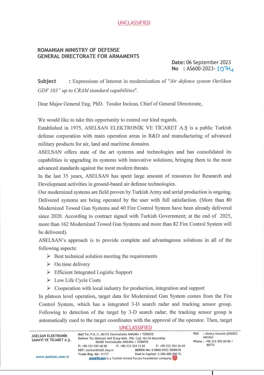 Potrivit comunicatului de presa official, al Rheinmetall, Ministerul român al Apărării a încheiat un contract cu Rheinmetall pentru modernizarea temeinică a sistemelor de artilerie de apărare aeriană Oerlikon GDF 103 ale țării. Pentru întreprinderea tehnologică din Düsseldorf, aceasta este prima comandă importantă din România, stat membru NATO și UE. În valoare de aproximativ 328 de milioane de euro, contractul include livrarea a patru sisteme, precum și instruire, piese de schimb și alte servicii. Două sisteme urmează să fie livrate în următorii doi ani și alte două în trei ani.
