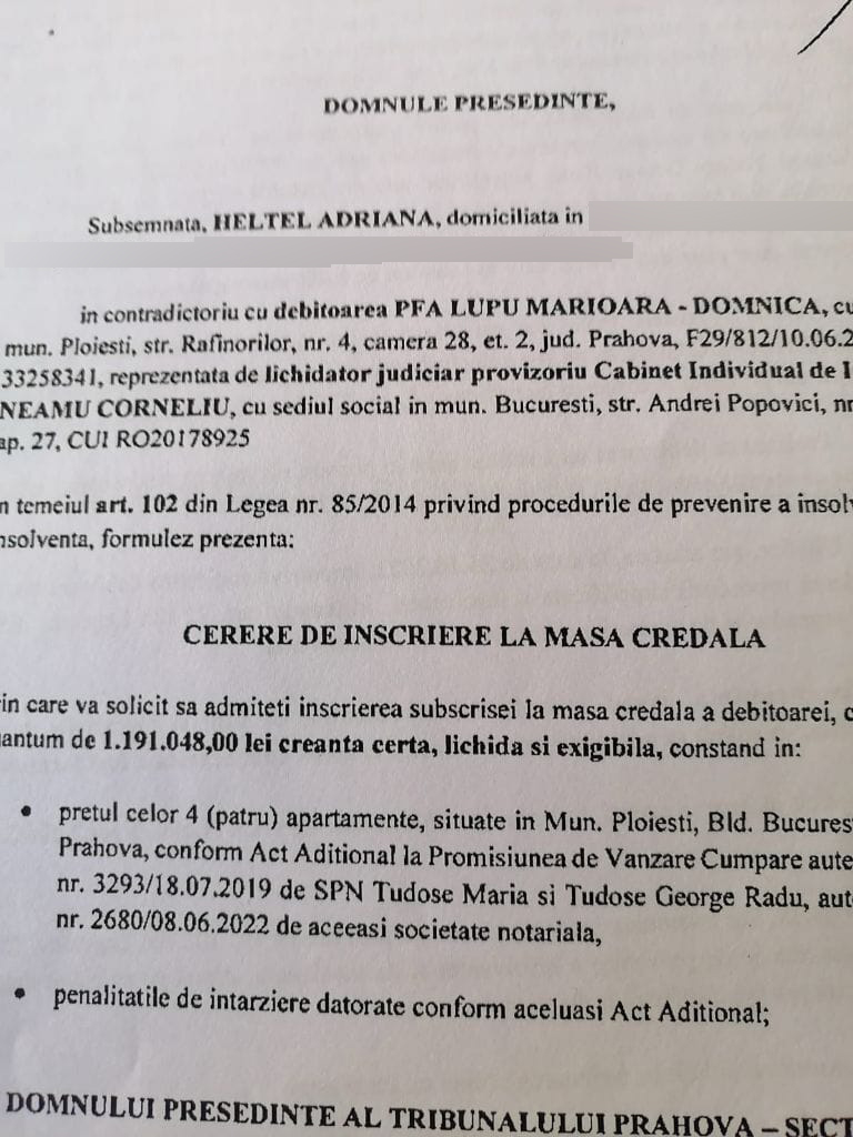 În luna decembrie 2023, XENIA INSOLV, reprezentată de neobositul avocat VLAD NICHITA comunică tabelul creanțelor APRODEM SA. Printre creditori, asociata septagenară LUPU MĂRIOARA care s-a înscris la masa credală cu o sumă de peste 700.000 de lei.