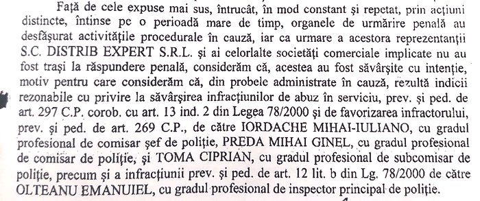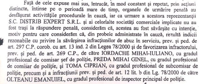 In cele din urma, prin referatul din 13 martie 2014, ofiterul DGA Adrian Radulescu a constatat ca: “Din probele administrate in cauza, rezulta indicii rezonabile cu privire la savarsirea infractiunilor de abuz in serviciu si de favorizarea infractorului de catre Iordache Mihai-Iuliano, Preda Mihai Ginel si Toma Ciprian, precum si a infractiunii prev. si ped. de art. 12 lit. b din Lg. 78/2000 (n.r. – folosirea, in orice mod, direct sau indirect, de informatii ce nu sunt destinate publicitatii ori permiterea accesului unor persoane neautorizate la aceste informatii) de catre Olteanu Emanuiel” (vezi facsimil 2).