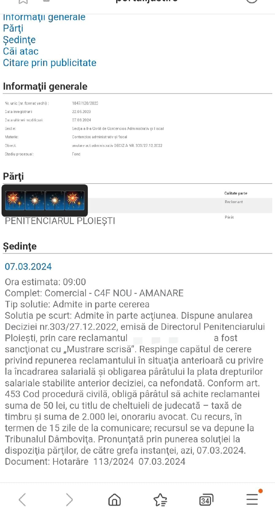 De curând, dușmanul de moarte al domnului Valentin Matei, fostul ofițer informații clasificare, a câștigat procesul impotriva domniei sale și a anulat o sancțiune aplicată abuziv. In afară de asta , instanța l-a obligat și la despăgubiri in valoare de 2050 ron. După ce soluția va rămâne definitivă vom cere directorului general să numească o comisie de cercetare administrativă și sumele ce se vor câștiga in instanță să fie recuperate de la director și de la membrii comisiei de disciplină care fac abuzuri, dovedite in instanță.