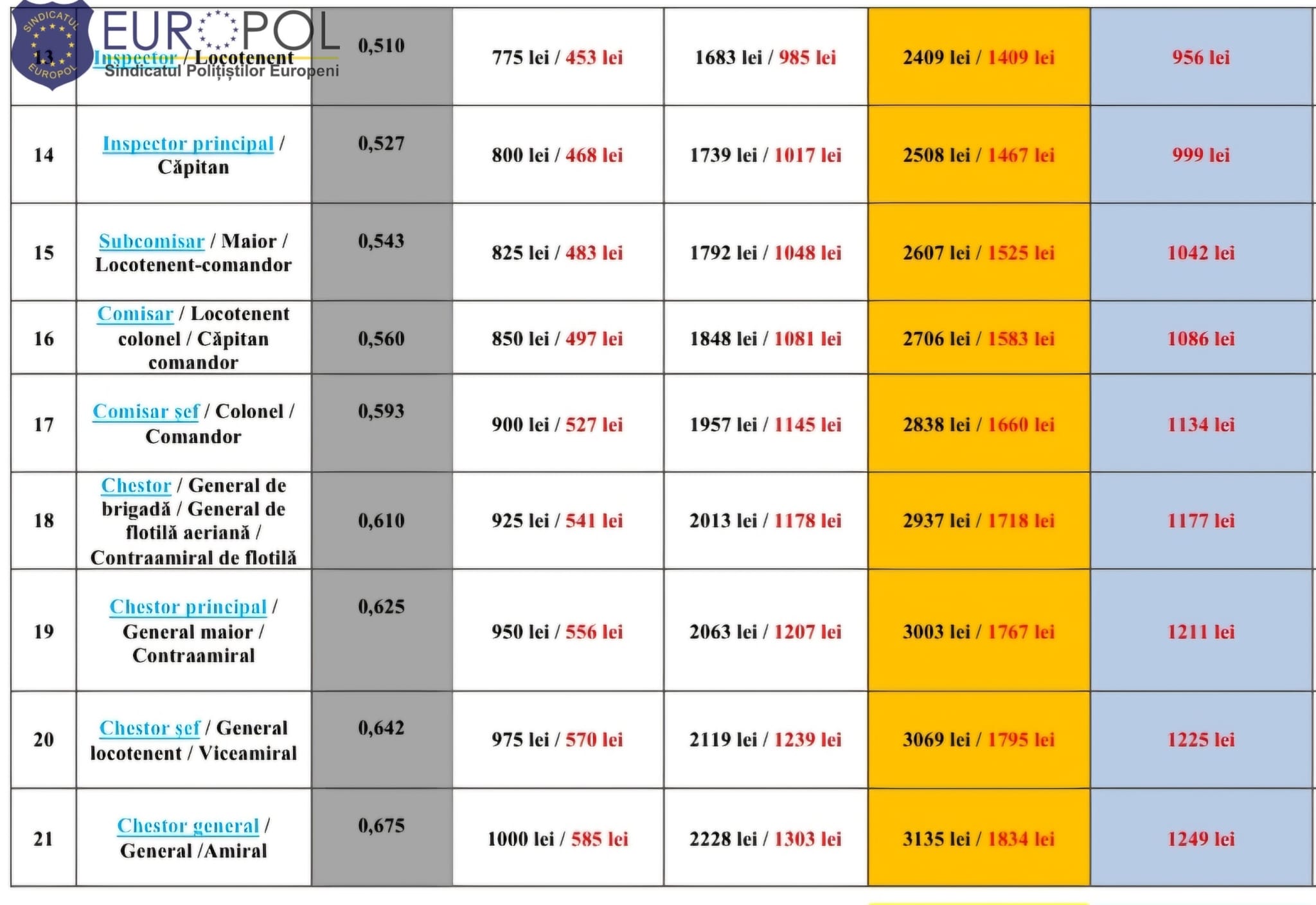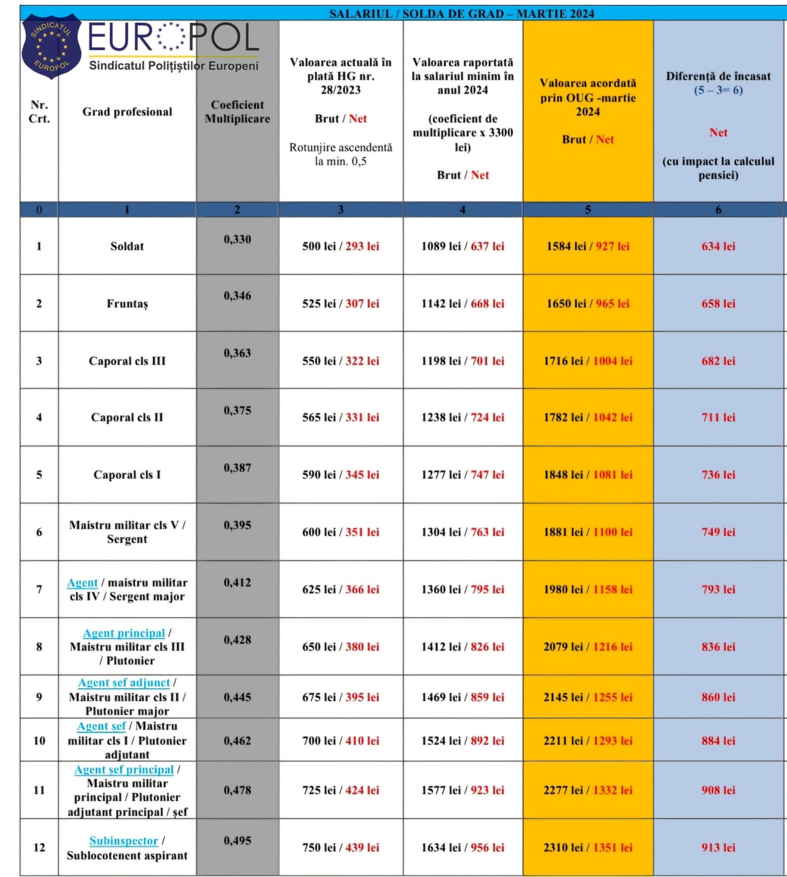 Vă aducem în atenție marcajul vizibil colorat în care veți regăsi valorile brute și nete ale salariului de grad pentru militari, polițiști și polițiști de penitenciare, ocazie cu care evidențiem una dintre cele mai semnificative evoluții pe linia drepturilor salariale din ultimii ani. Este important de reținut că acestea reprezintă rezultatul mobilizării polițiștilor pentru acțiunea de protest ce fusese programată în cursul acestei zile în fața Ministerului Afacerilor Interne și subliniem încă o dată faptul că nu ne vom opri aici, fiind extrem de importantă actualizarea normei de hrană având în vedere creșterea inflației.