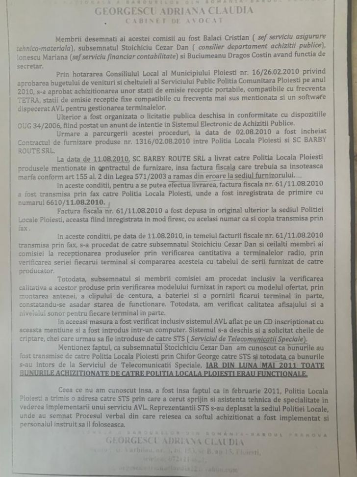 Notă: CHIFOR GEORGE IONUȚ a semnat, totuși două procese verbale de predare primire: Procesul verbal de punere în funcțiune a serviciului de localizare în teren a terminalelor Tetra încheiat între Serviciul de Telecomunicații Speciale prin col. VASILE MARIAN (nr. 630604/06.05.2011) și Poliția Locală Ploieșți, prin  CHIFOR GEORGE (nr. 1552/10.05.2011) șProcesul verbal de punere în funcțiune a serviciului de comunicații de buclă locală pentru aplicația de management a serviciului AVL încheiat între aceleași instituții prin CRIȘU SEBASTIAN de la STS (nr. 630580/29.04.2011), respectiv nr. 1480/05.05.2011 la Poliția Locală Ploieșți, prin CHIFOR GEORGE.