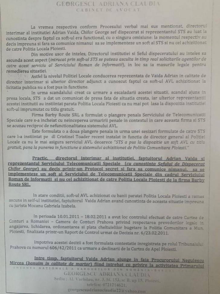 Plângerea a fost făcută de fostul director general TOADER în numele instituției pe care o conducea, conținea datele și informațiile pe care i le prezentasera trunchiat și inexact foștii directori generali, VAIDA ADRIAN și TĂNASE DANIEL, precum și multe omisiuni cu rea credință pentru ascunderea adevărului și în dorința de a prezenta variante false ale situației de fapt, de către cei doi funcționari publici foști în funcții de conducere la nivelul Poliției Locale Ploieșți, privind încheierea și derularea contractului de achiziții publice a 120 terminale TETRA și a soft-ului AVL de la SC BARBY ROUTE SRL Brașov.