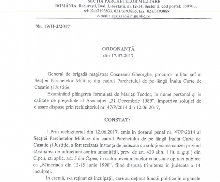 Procurorii miltari au luat, prin Rechizitoriul din 12 iunie 2017, decizia de clasare a cauzei ca parte vătămată în privinţa lui Corneliu Coposu şi a uneia dintre surorile sale, a partidelor şi instituţiilor publice care au fost devastate, a “Asociaţiei 21 decembrie 1989”, dar şi a preşedintelui acesteia, Teodor Mărieş. Acesta din urmă a făcut plângere împotriva măsurii, care i-a fost respinsă prin Ordonanţa din 17.07.2017 a şefului Secţiei Parchetelor Militare, general de brigadă magistrat Gheorghe Cosneanu. În plângere, Mărieş scria: “ceea ce mă onorează dar şi mă întristează, în acelaşi timp, este faptul că tot în această categorie se încadrează şi ”seniorul” Corneliu Coposu, dar şi sora acestuia, despre care se ştie că au fost ţinte principale ale Mineriadei din 13-15 iunie 1990. Alături de noi se află şi persoane care se pare că nu au suferit vătămări de nici un fel (…) Mă întreb, cum a fost posibil ca aceiaşi procurori militari să-mi confere la data de 21.10.2016 calitatea de persoană vătămată, ca urmare a săvârşirii infracţiunii contra umanităţii, iar la data de 13 iunie 2017 ”să-mi ridice tot ei această calitate, fără ca între timp să se administreze vreo probă care să le fundamenteze această ultimă decizie?”. Generalul Cosneanu a motivat că în cazul lui Mărieş acesta nu a suferit vătămări, deşi a stat patru luni nevinovat în arest, aşa cum a stabilit Înalta Curte prin decizie definitivă în 1992. În ce priveşte distrugerea sediilor Universităţii Bucureşti, PNŢCD, PNL etc., şeful Parchetelor Militare a arătat că aceasta nu întruneşte “elementele de tipicitate ale vreuneia dintre variantele normative ale infracţiunilor contra umanităţii”.