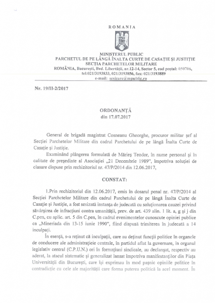 Procurorii miltari au luat, prin Rechizitoriul din 12 iunie 2017, decizia de clasare a cauzei ca parte vătămată în privinţa lui Corneliu Coposu şi a uneia dintre surorile sale, a partidelor şi instituţiilor publice care au fost devastate, a “Asociaţiei 21 decembrie 1989”, dar şi a preşedintelui acesteia, Teodor Mărieş. Acesta din urmă a făcut plângere împotriva măsurii, care i-a fost respinsă prin Ordonanţa din 17.07.2017 a şefului Secţiei Parchetelor Militare, general de brigadă magistrat Gheorghe Cosneanu. În plângere, Mărieş scria: “ceea ce mă onorează dar şi mă întristează, în acelaşi timp, este faptul că tot în această categorie se încadrează şi ”seniorul” Corneliu Coposu, dar şi sora acestuia, despre care se ştie că au fost ţinte principale ale Mineriadei din 13-15 iunie 1990. Alături de noi se află şi persoane care se pare că nu au suferit vătămări de nici un fel (…) Mă întreb, cum a fost posibil ca aceiaşi procurori militari să-mi confere la data de 21.10.2016 calitatea de persoană vătămată, ca urmare a săvârşirii infracţiunii contra umanităţii, iar la data de 13 iunie 2017 ”să-mi ridice tot ei această calitate, fără ca între timp să se administreze vreo probă care să le fundamenteze această ultimă decizie?”. Generalul Cosneanu a motivat că în cazul lui Mărieş acesta nu a suferit vătămări, deşi a stat patru luni nevinovat în arest, aşa cum a stabilit Înalta Curte prin decizie definitivă în 1992. În ce priveşte distrugerea sediilor Universităţii Bucureşti, PNŢCD, PNL etc., şeful Parchetelor Militare a arătat că aceasta nu întruneşte “elementele de tipicitate ale vreuneia dintre variantele normative ale infracţiunilor contra umanităţii”.