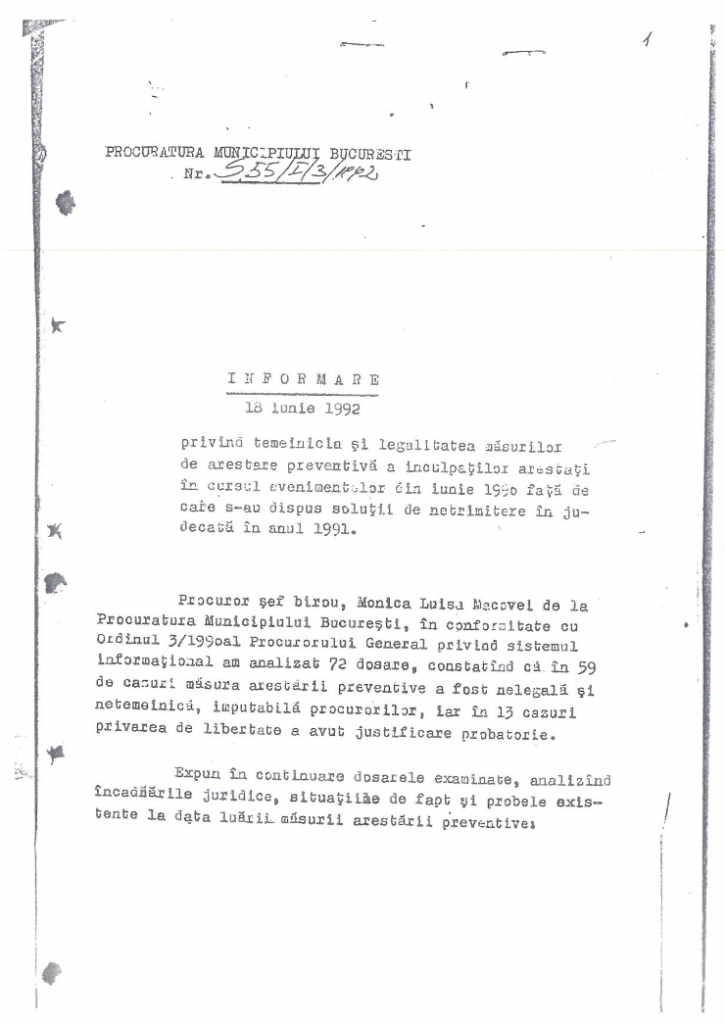 În urma acestor verificări s-a confirmat nelegalitatea măsurilor preventive dispuse, stabilindu-se că dintr-un număr de 72 dosare penale analizate, în 59 măsura arestării preventive a fost nelegală. La finalul cercetărilor, procurorii inspectori din cadrul Procuraturii Municipiului Bucureşti a întocmit raportul S55/I/3 din18 iunie 1992, care constata că cele 1200 de persoane au fost reţinute nelegal, într-un interval cuprins între una şi opt zile în două unităţi militare, motiv pentru care a fost sesizată Direcţia Procuraturilor Militare pentru tragerea la răspundere penală a cadrelor militare dar şi a civililor vinovaţi. Materialului de control a fost trimis şi la Direcţia I a Procuraturii Generale, singura competentă la vremea respectivă să efectueze cercetări asupra procurorilor implicaţi şi a “cauzelor care au determinat această eroare judiciară colectivă”.