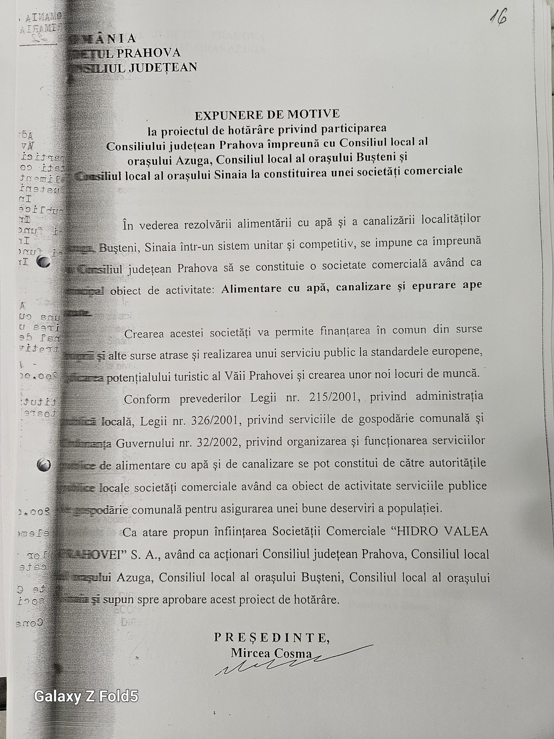Trebuie amintit că ponderea de reprezentare în Consiliul de Administrație al HidroPrahova, a orașului Azuga, este 0,14%! Atât a obținut Adrian Purcaru în schimbul cedării către Consiliul Județean de atunci a tuturor resurselor de apă ale Azugii – 0,14%.