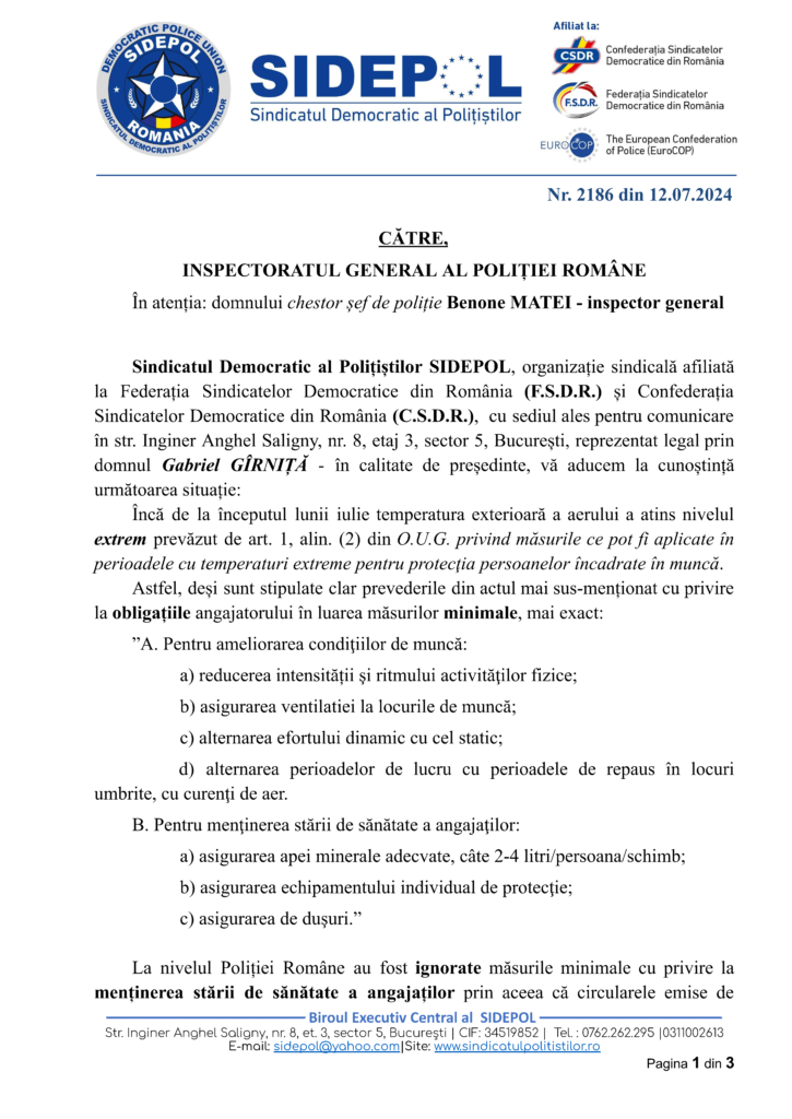În anul 2024, în cadrul Uniunii Europene și într-un stat care se pretinde a fi un stat de drept, respectarea prevederilor legale pare a fi opțională, conform observațiilor Sindicatului Sidepol. Deși suntem deja în mijlocul verii, respectarea drepturilor polițiștilor în această perioadă caniculară pare a fi pusă în plan secundar, chiar dacă Ordonanța de Urgență 99/2000 impune clar angajatorului anumite măsuri esențiale pentru menținerea sănătății angajaților: