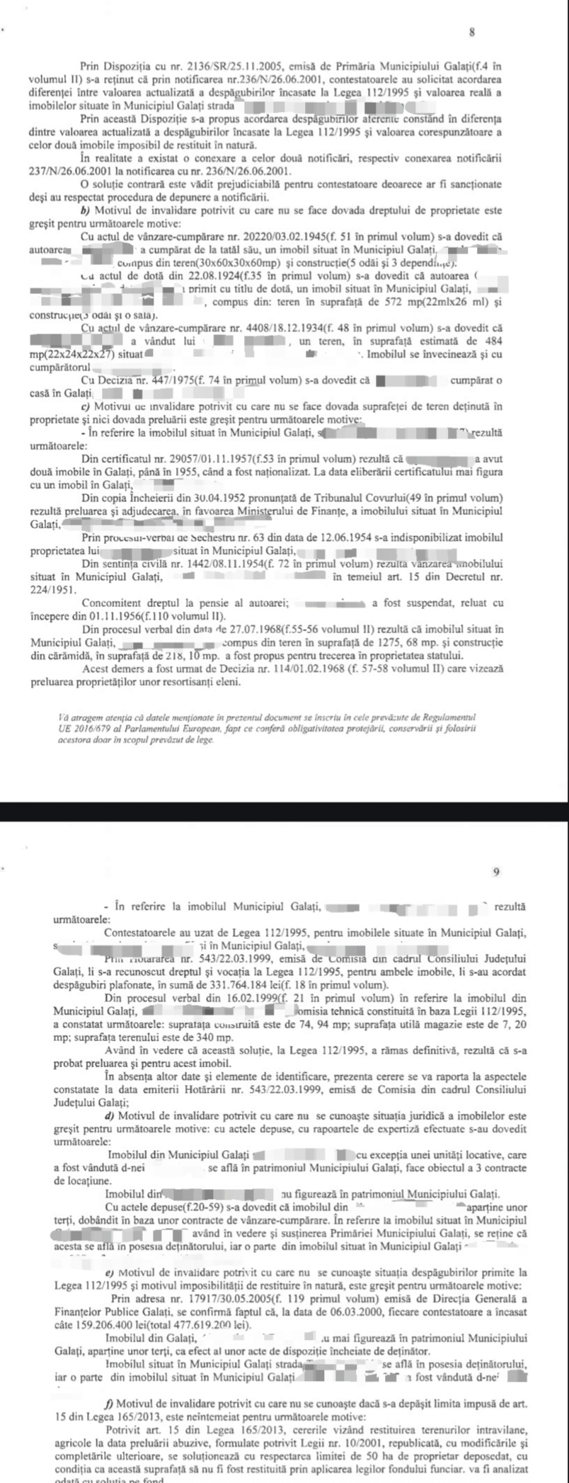 Curtea de Apel Galați a emis o decizie în acest dosar, susținând că preluarea imobilelor a fost abuzivă, însă argumentele și documentele utilizate pentru această concluzie nu sunt adecvate sau justificate în mod corespunzător. Există suspiciuni grave că judecătorii implicați au interpretat legea în mod eronat sau au fost influențați în mod inadecvat în soluționarea acestui caz.