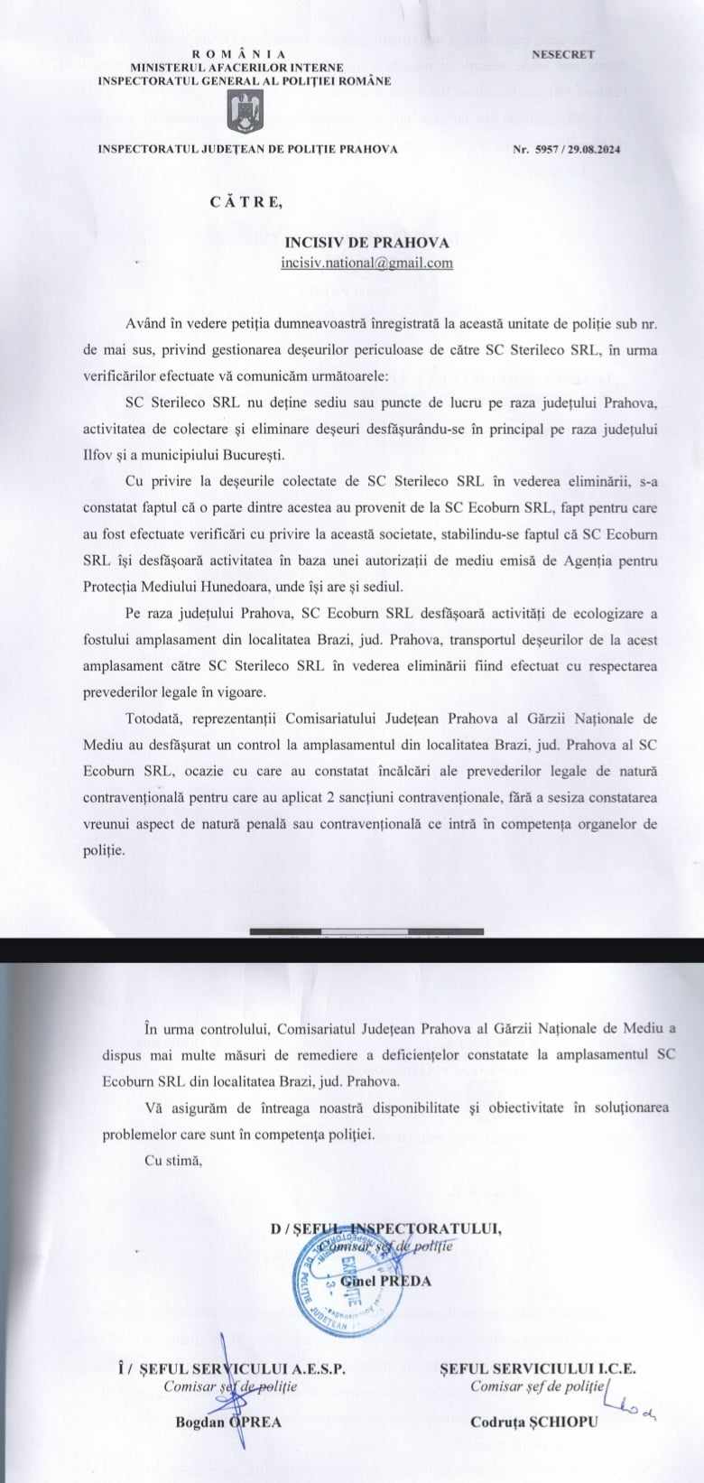Merită subliniat și faptul că actualul împuternicit al IPJ Prahova, Ginel Preda, a încercat să minimalizeze aceste probleme, sugerând că, deoarece Sterileco nu are sediul în Prahova, instituția sa nu are competența de a interveni. Aceasta este o abordare problematică, sugerând o atitudine de evaziune a responsabilității.