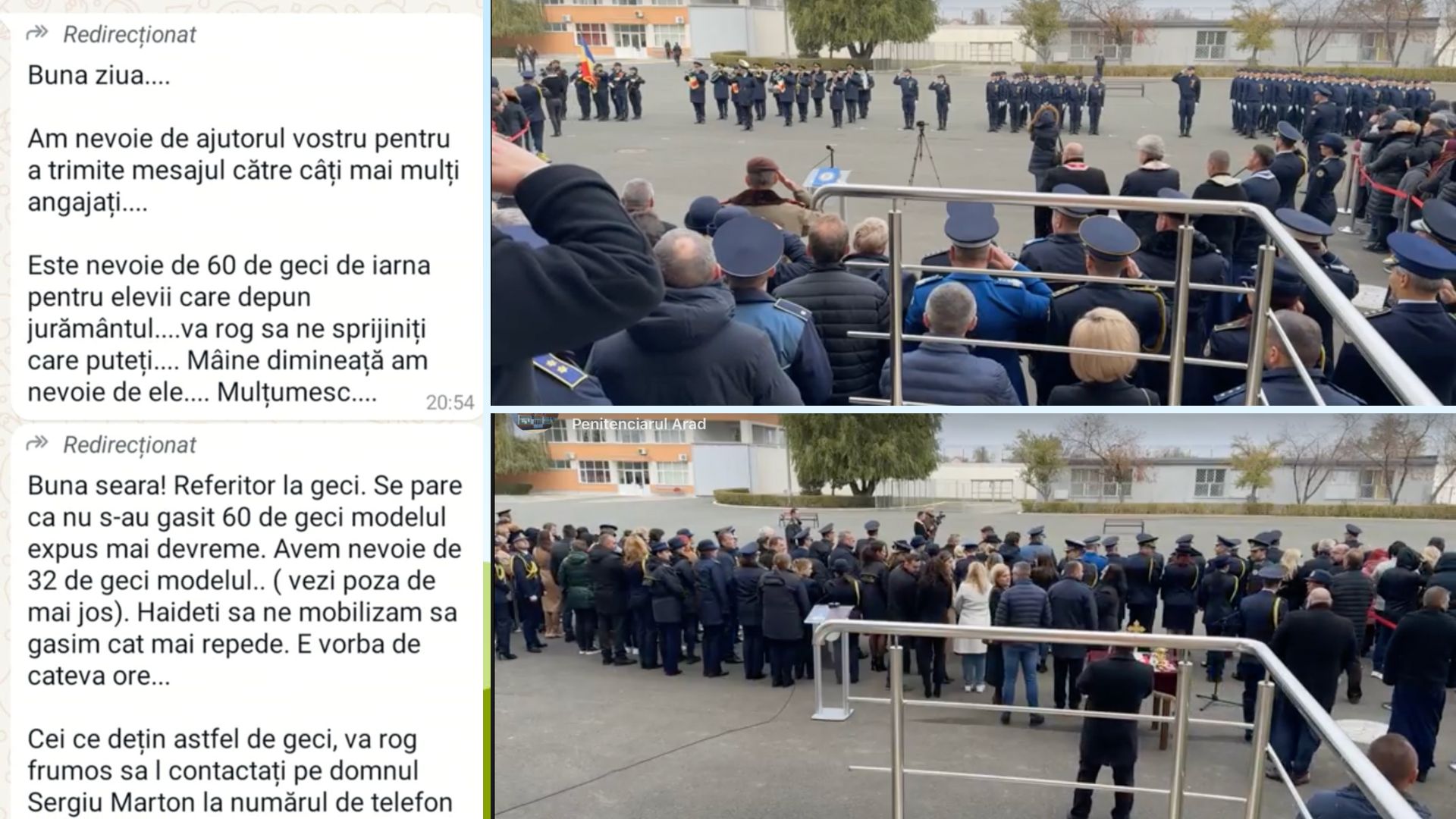 FSANP a semnalat: “Astăzi, 14 noiembrie 2024, în Arad, 60 de elevi ai Școlii Naționale de Pregătire a Agenților de Penitenciare Târgu Ocna (SNPAP Tg. Ocna) – Secția ARAD, condusă de domnul Sergiu MARTIN, depun jurământul. Avem informația că 32 de elevi din cei 60 ar putea să depună jurământul fără geci de iarnă, la o temperatură de maxim 4 grade Celsius. Până la apariția articolului, pentru cei 32 de elevi nu s-au găsit geci. Pe Whatsapp, se cere “mobilizarea” pentru rezolvarea problemei.”