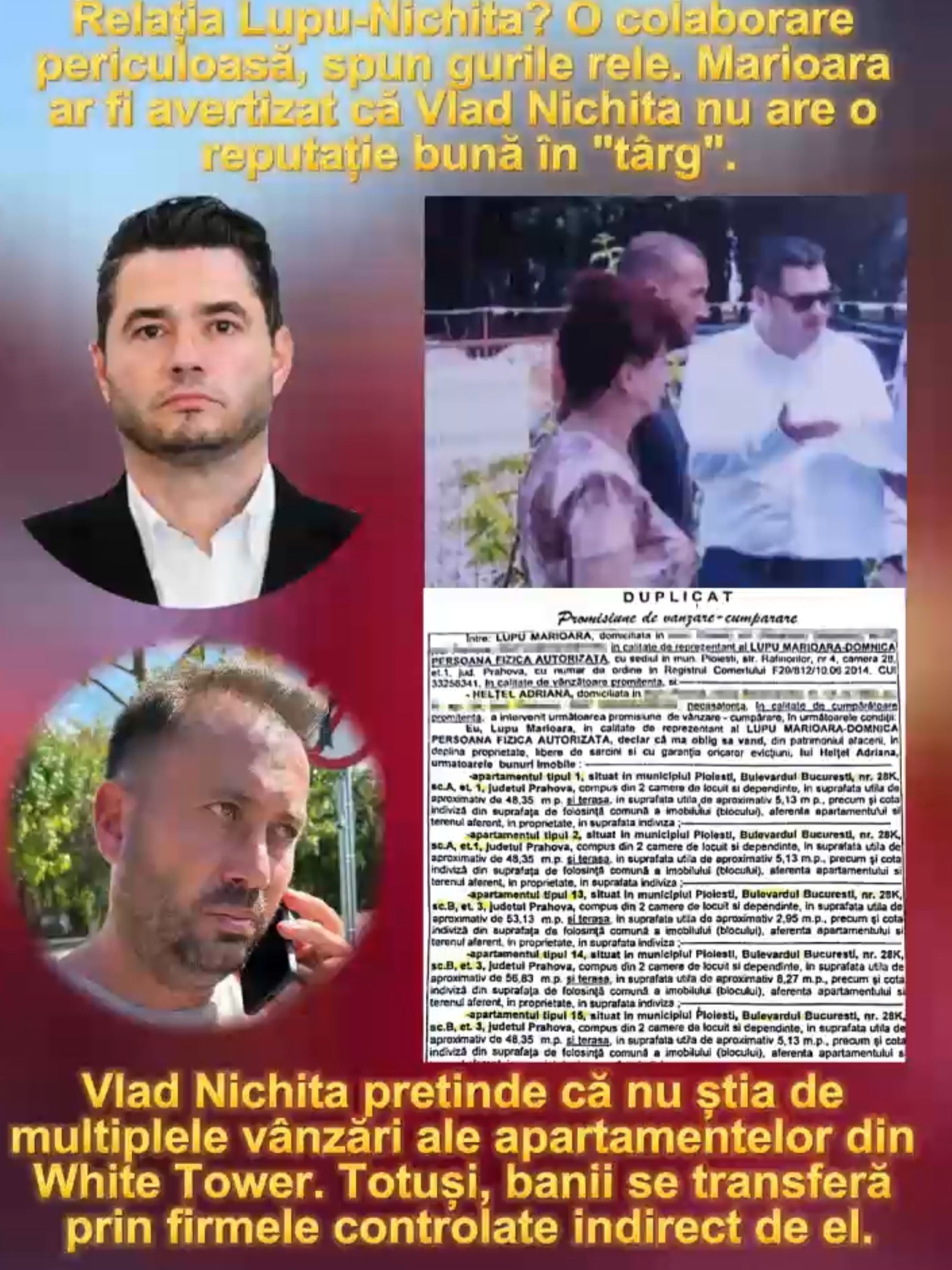 Dimpotrivă, Vlad Nichita a încercat să se disocieze de acțiunile lui Marioara, pretinzând că nu a fost la curent cu neregulile sale, inclusiv vânzarea repetată a apartamentelor din proiectul White Tower. Totodată, sumele care proveneau din apartamentele de la PFA Lupu Marioara au fost conectate la societatea Fasty Tasty SRL, de asemenea implicată în activități discutabile.