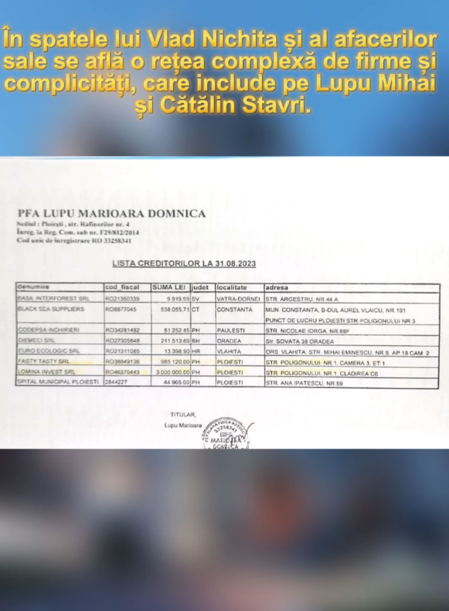 Vlad Nichita, cunoscut ca „Il capo”, a avut un rol central în administrarea dosarelor de faliment ale PFA Lupu Marioara Domnica, reprezentată de Mărioara Lupu, mama dezvoltatorului imobiliar Mihai Lupu, responsabil pentru construirea blocurilor de apartamente din diferitele cartiere ale Ploieștiului. De asemenea, el are legături cu SC Aprodem SA, unde Mărioara Lupu este acționar majoritar, precum și cu mai multe societăți numite generic Milex, înființate pe numele lui Mihai Lupu, Mărioara Domnica Lupu, Tache Alexandra și altele.