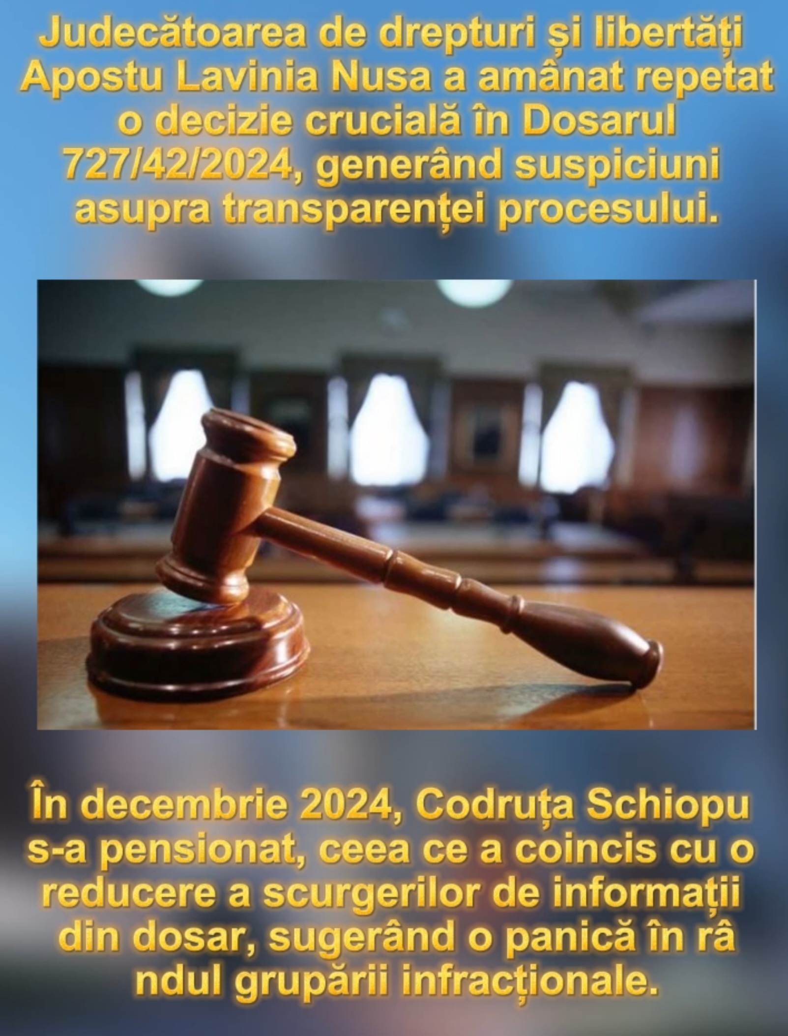 În decembrie 2024, Codruța Schiopu și-a înaintat raportul de pensionare, iar întârzierea din dosar, coroborată cu atacurile recente ale inculpatului pseudojurnalist Cătălin Stavri, ar putea indica o panică a grupării, care nu mai avea informații despre planurile procurorului.