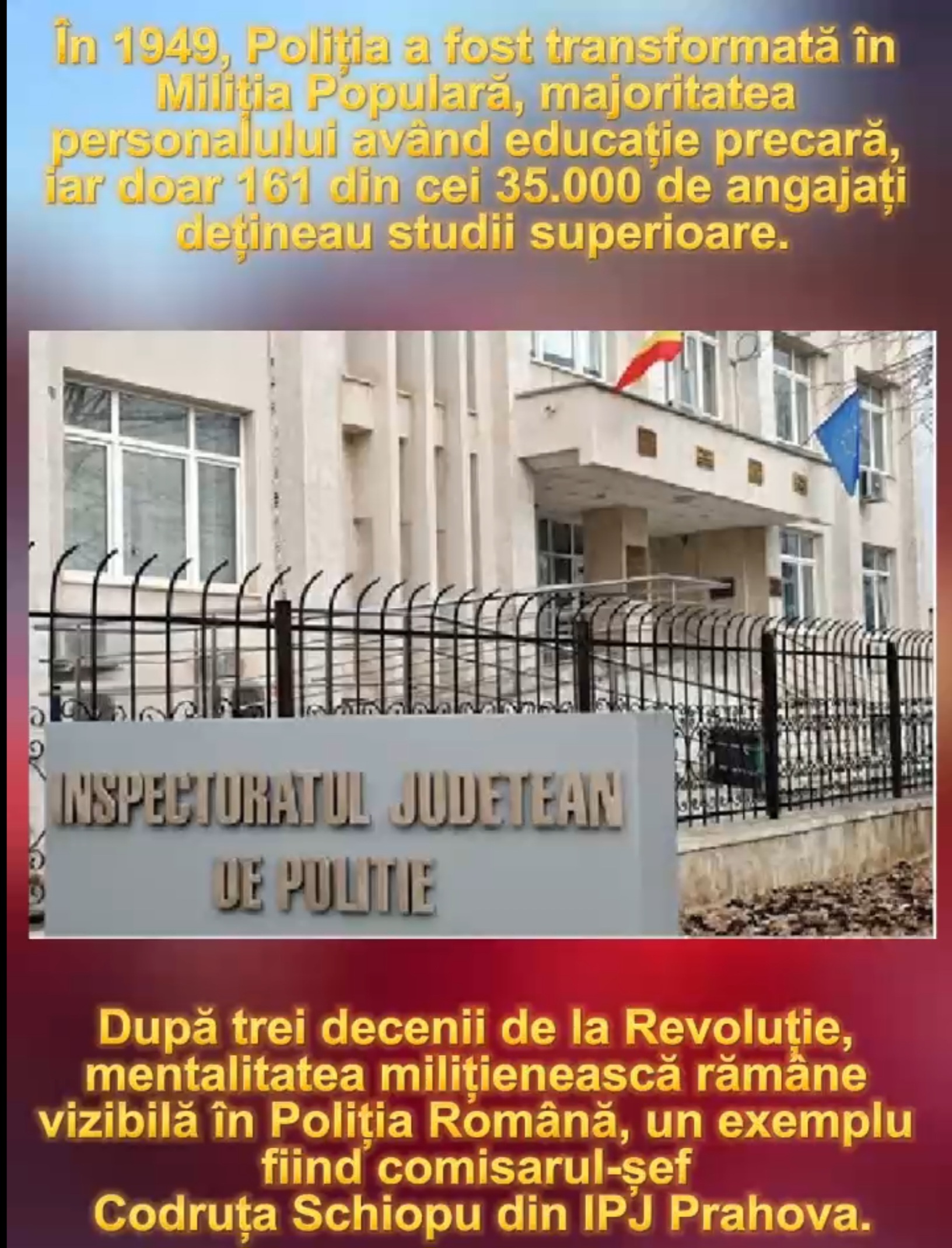După mai bine de 30 de ani de la Revoluție, te-ai aștepta ca cetățenii să nu mai întâlnească mentalitatea milițienească în Poliția Română. Din păcate, realitatea este alta. La IPJ Prahova, recent s-a descoperit un exemplu al acestei mentalități, în persoana COMISARULUI ȘEF DE POLIȚIE CODRUȚA ȘCHIOPU, șef al SERVICIULUI DE INVESTIGARE A CRIMINALITĂȚII ECONOMICE.