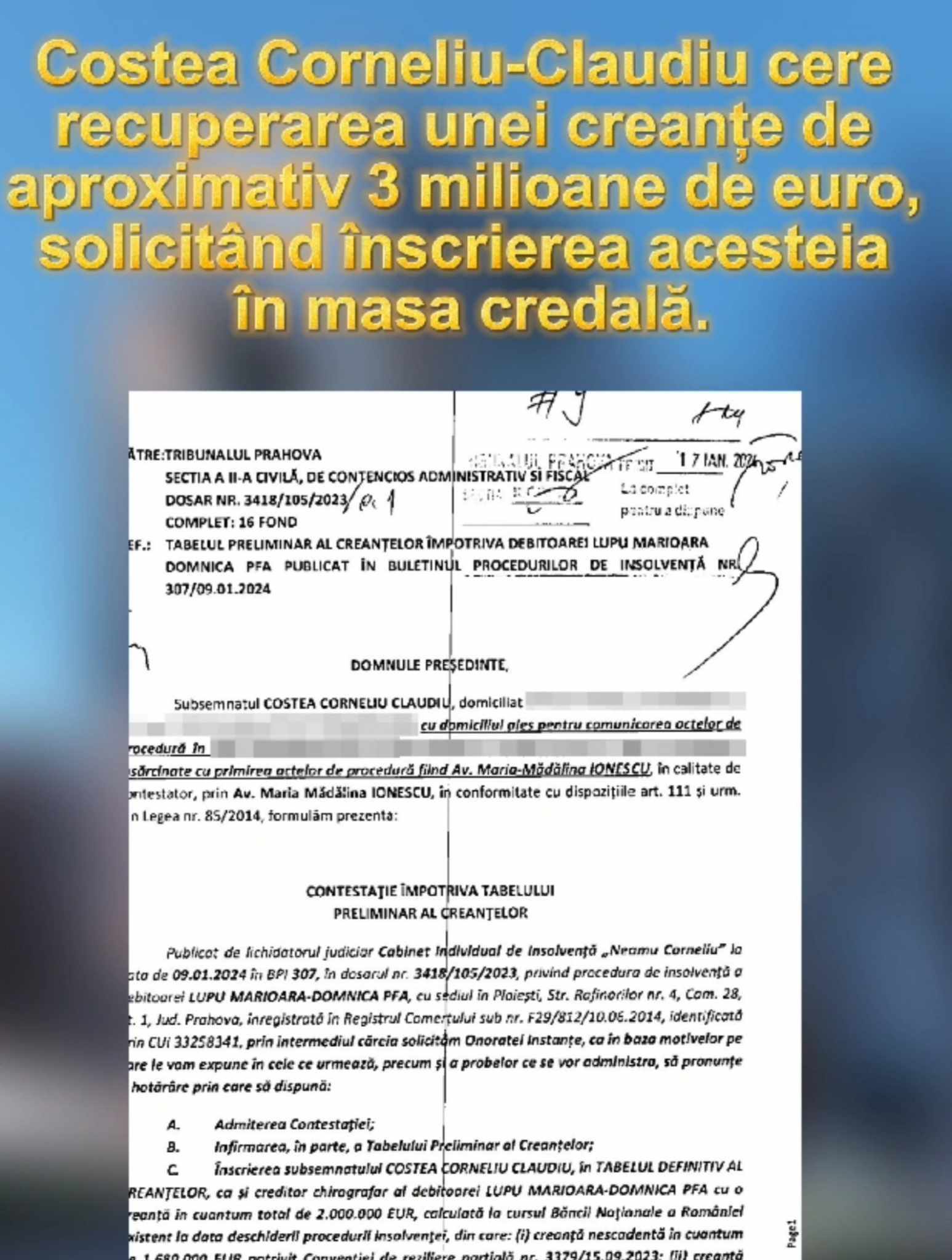 Dosarul de faliment al PFA Lupu Marioara, aflat în atenția ANAF, oferă o imagine clară a amplorii escrocheriilor. Suma fabuloasă de aproximativ 3 milioane de euro solicitată la masa credală reprezintă un „trofeu” al acestei operațiuni criminale, evidențiind profiturile uriașe obținute prin activități ilegale. Documentele obținute exclusiv de Incisiv de Prahova vor fi prezentate: