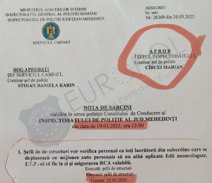 Sindicatul Europol dezvăluie un episod halucinant în care comisarul-șef Mihai Titu Valentin („MTV”), șeful Centrului Operațional din cadrul IPJ Mehedinți, a fost sancționat de un agent de ordine publică pentru nepurtarea centurii de siguranță și utilizarea de folii neomologate pe geamurile mașinii sale. Reacția sa a fost una de o violență verbală extremă, numindu-l pe agent „drogat” și „bețiv” și apelând la 112 pentru a-l denigra, într-o evidentă tentativă de intimidare. Încă neclar este și motivul prezenței sale la volanul mașinii personale în timpul programului de lucru. Se bănuiește că conducerea IPJ Mehedinți încearcă să găsească o justificare pentru absența sa și să minimizeze gravitatea incidentului.