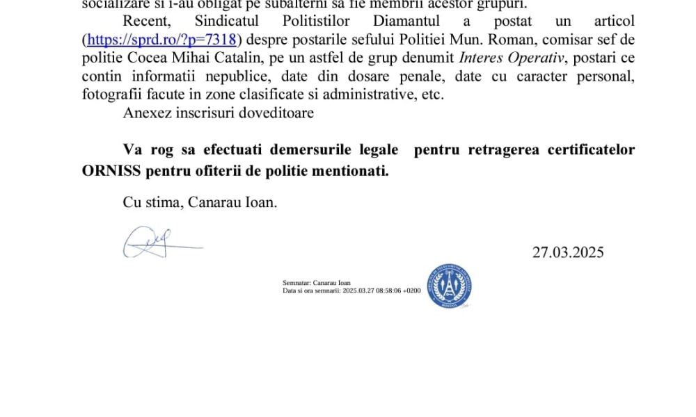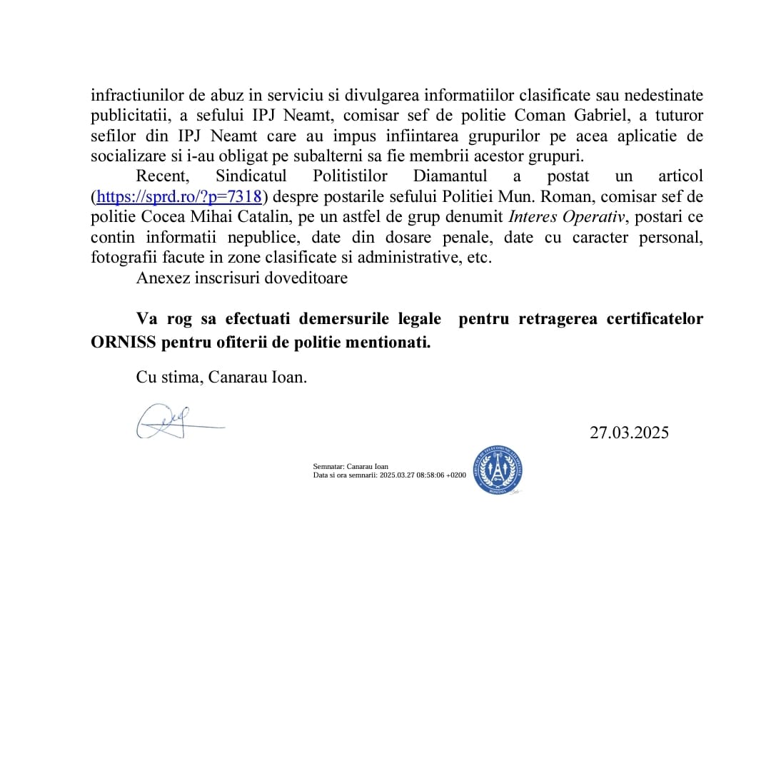 Este esențial ca autoritățile competente să investigheze aceste acuzații și să protejeze integritatea sistemului polițienesc, asigurându-se că abuzurile nu sunt tolerate și că informațiile funcționează în interesul cetățenilor, nu al intereselor personale. (Cerasela N.).