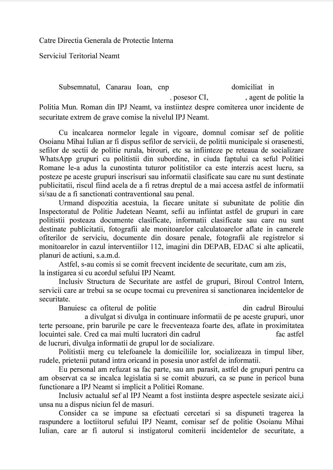 Un exemplu notabil este comportamentul comisarului șef de poliție Oprea Cristian, de la Secția de Poliție Rurală 7 Sagna. Acesta a fost acuzat că, prin metode coercitive, ar fi cerut fiecărui polițist în parte să îi înmâneze telefoanele personale pentru a șterge grupurile și informațiile considerate compromise. Această acțiune a fost denumită gravă și abuzivă, mai ales în contextul existenței unui dosar penal deschis de Parchetul de pe lângă Tribunalul Neamț, care cercetează aceste aspecte legate de divulgarea informațiilor din dosarele penale.