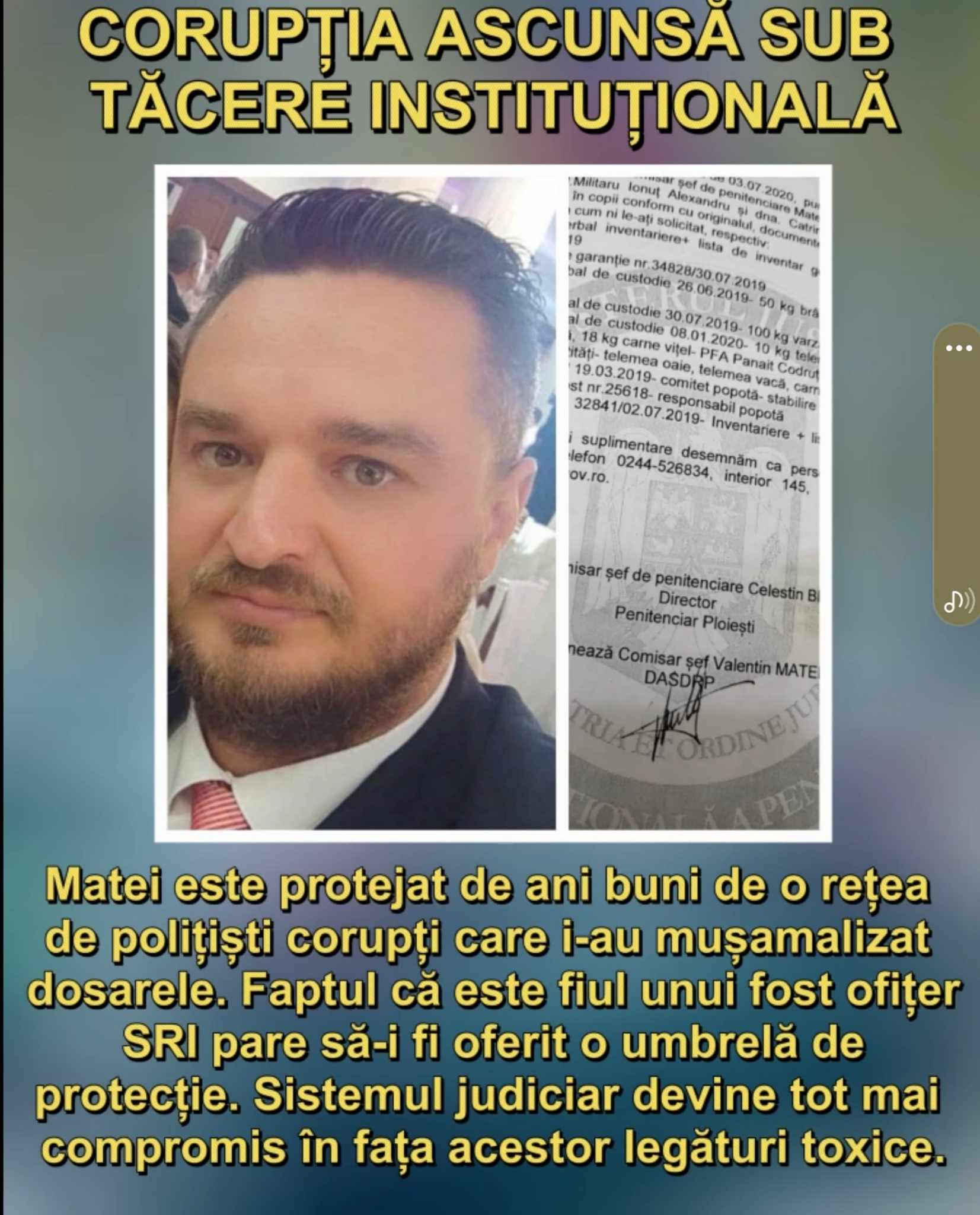 Coruptul Valentin Matei a beneficiat de prea multă vreme de protecția unor polițiști corupți, care au mușamalizat dosarele sale penale cu un tupeu incredibil. Faptul că Matei este fiul unui ofițer SRI a îngreunat și mai mult situația, sugerând că există legături puternice în cadrul instituțiilor de forță care l-au apărat de consecințele acțiunilor sale ilegale. Această realitate ridică întrebări serioase despre integritatea sistemului de justiție și despre cât de profund s-a infiltrat corupția în structurile sale. Este timpul ca acest „buboi” să fie spart și adevărul să iasă la suprafață!