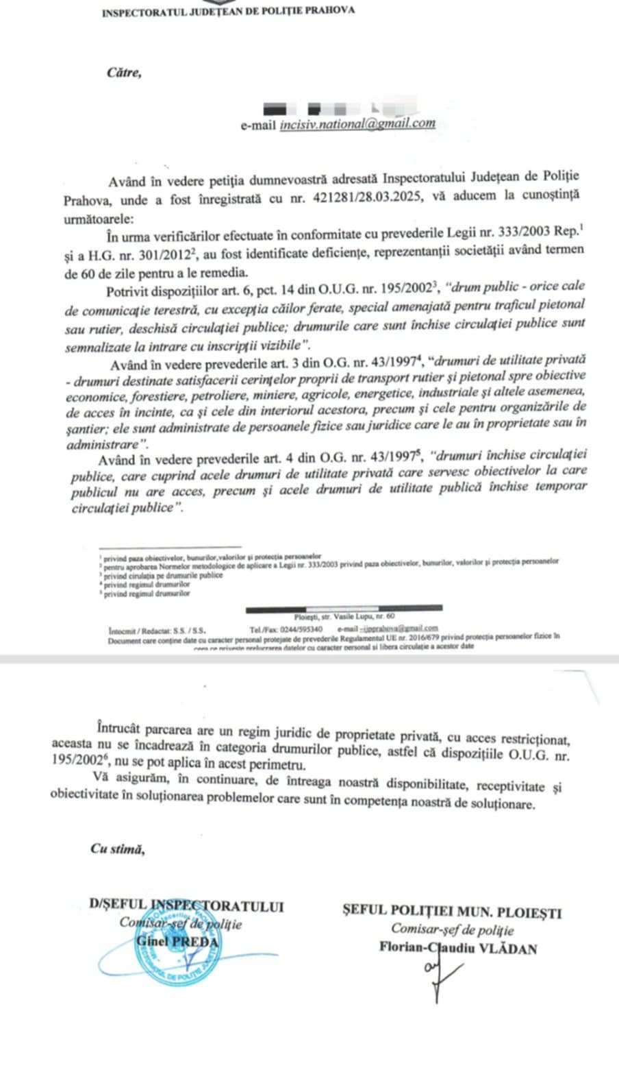 Investigația jurnalistică de la „Incisiv de Prahova” continuă să producă efecte, având în vedere că Inspectoratul Județean de Poliție Prahova a emis recent, prin adresa nr. 421281 din 11.04.2025, o confirmare parțială a dezvăluirilor privind ilegalitățile din Vama Ploiești. Din păcate, reacția IPJ rămâne distantă și puțin convingătoare, menționând doar identificarea unor deficiențe care trebuie remediate de către reprezentanții societății în termen de 60 de zile.