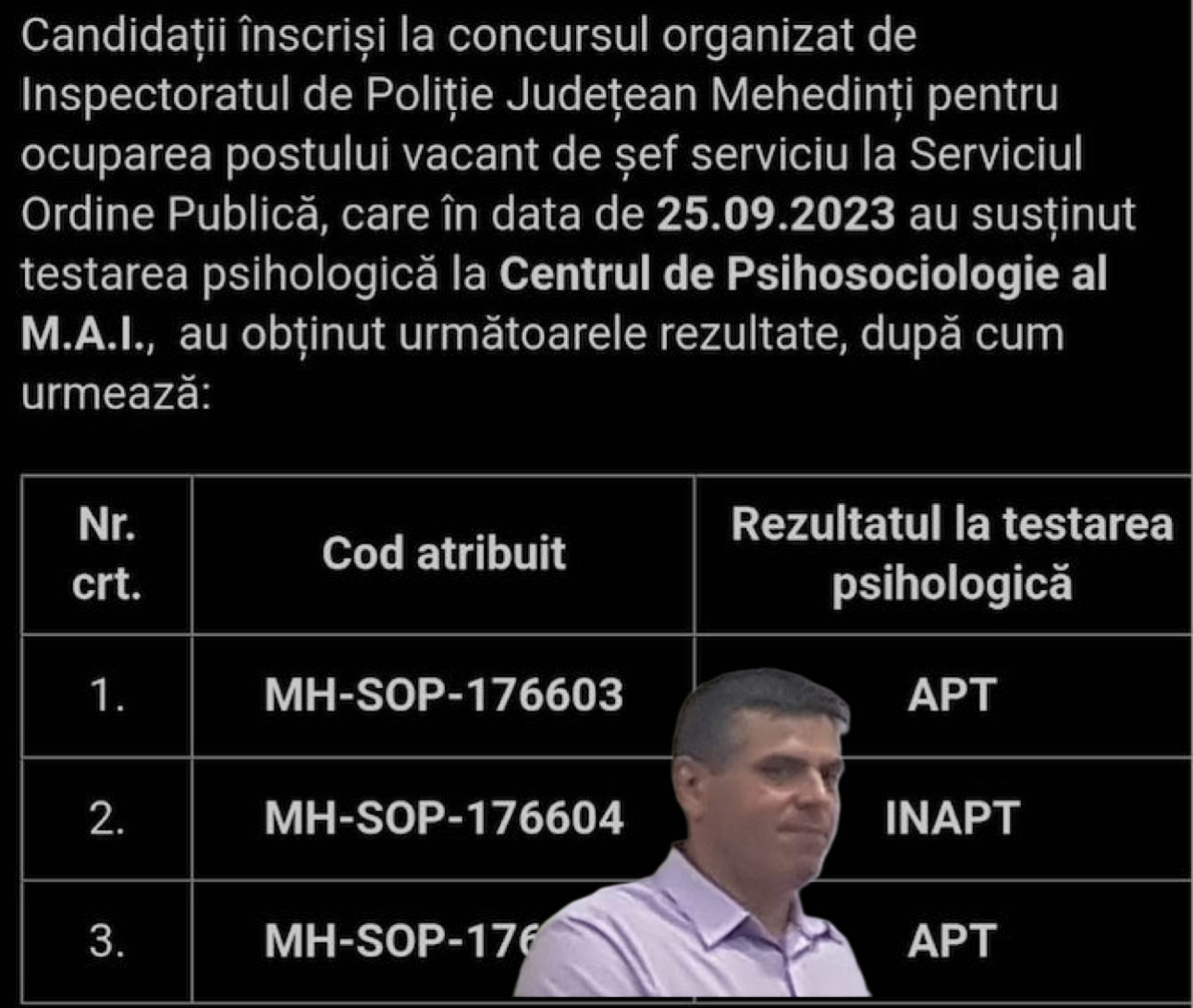 Totul a început acum mai bine de un an, când s-a organizat concurs pentru postul de șef serviciu ordine publică. Trei candidați s-au înscris. Printre ei, și comisarul-șef Cepeș Florin. La testarea psihologică, însă, acesta a fost declarat INAPT PSIHOLÓGIC, deci temporar ieșit din cursă. Cu toate acestea, Ofițerul a fost numit în final șef, după proba de interviu, iar câștigătoarea, insp. pr. Amalia Cioroianu, a renunțat rapid, aparent din motive personale, la funcție și a acceptat o poziție mai umilă, de șef birou al Protecției Animalelor.
