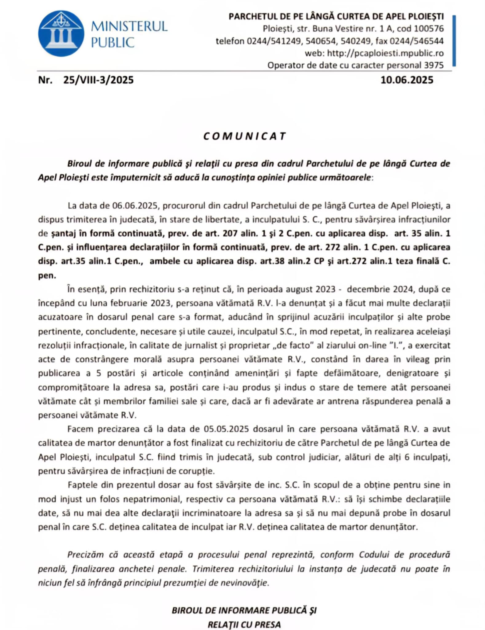 Confirmarea oficială a măsurilor judiciare recente, inclusiv menținerea controlului judiciar în cazul pseudo-jurnalistului spagar si santajist Catalin Stavri, Volosevici si interlorlopul Claudiu Belu (aici), (aici), (aici), (aici), (aici), (aici), (aici), etc, nu face decât să întărească ceea ce am spus încă din 2019: sistemul, corupt și protejat, continuă să blocheze anchetele și reformele. Soluțiile instanței, interpretate ca semnale de alarmă, arată clar că în Prahova există un pericol real ca influența, șantajul și manipularea să persiste.