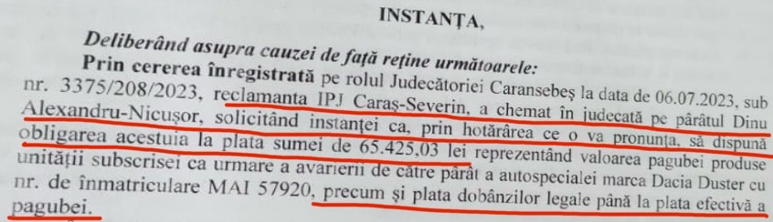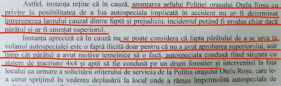 Din fericire, instanța a analizat obiectiv cazul și a respins acțiunea IPJ Caraș-Severin. Judecătorul a apreciat că incidentul a fost un eveniment neprevăzut, independent de voința polițistului, și că prezența sa acolo era necesară pentru a ajuta colegii aflați în dificultate. Astfel, agentul a fost exonerat de plata sumei de 65.000 de lei.