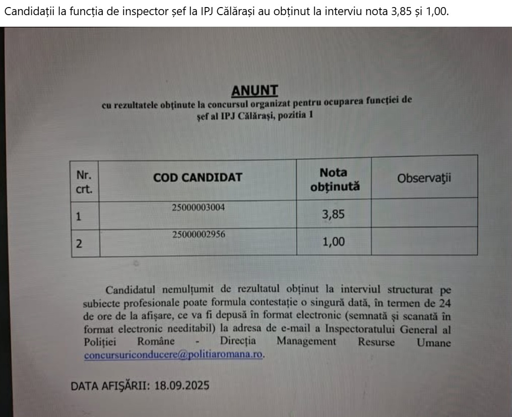 Încheiem apoteotic cu IPJ Călărași, unde rezultatele la concursul pentru șefia inspectoratului sunt demne de Cartea Recordurilor la categoria „incompetență crasă”. Note de 3,85 și chiar 1,00 (unu!) ne fac să ne întrebăm dacă nu cumva au candidat niște refugiați analfabeți sau niște livratori Glovo încurcați la traseu. Serios, cum e posibil să ajungi să conduci un inspectorat de poliție cu asemenea note? Mai bine închidem prăvălia și punem un paznic de supermarket șef, că poate se pricepe mai bine!