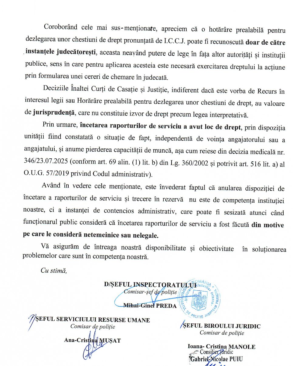 Aici, „Dorel de la IPJ Prahova” revine în forță! Conform șefului (desemnat) Ginel, RIL-urile ICCJ și hotărârile pentru dezlegarea unor chestiuni de drept nu sunt obligatorii pentru nimeni! Nici pentru el, nici pentru șeful SRU, nici pentru șeful de la juridic. De ce să respectăm deciziile Înaltei Curți când putem să ne facem propria lege, direct de la Prahova? Mai mult, ne explică, cu o aroganță crasă, că o hotărâre a ICCJ poate fi recunoscută doar de instanțele judecătorești și că, de fapt, încetarea raporturilor de serviciu a fost „de drept”, independent de voința angajatorului sau a angajatului. Adică, dacă te-ai trezit într-o dimineață și ai chef să dai pe cineva afară, poți să o faci, că oricum e „de drept”!