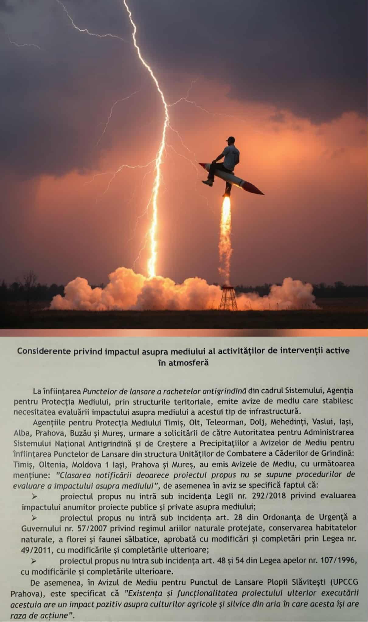Și ce face Agenția pentru Protecția Mediului (APM)? Dă avize pe bandă rulantă, fără să verifice dacă rachetele antigrindină otrăvesc solul, apa și aerul cu iodură de argint! Parcă sunt complici la deșertificarea României! Dormiți liniștiți, noi vă furăm cerul!