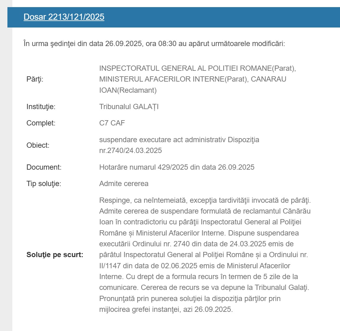 După ce a obținut în instanță suspendarea primei destituiri disciplinare, liderul Europol Neamț, Ioan Cănărău, a fost victima unui deja-vu: șefii IPJ Neamț, în loc să-l reîncadreze, i-au trântit în față o nouă sancțiune de destituire. Dar, surpriză, surpriză! Tribunalul Galați a spulberat și această a doua tentativă de linșaj profesional, printr-o sentință executorie (nr. 429/2025) care îl readuce pe Cănărău la datorie începând de astăzi, 27 septembrie 2025.