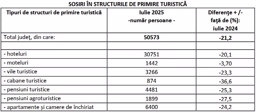 Numărul turiştilor sosiţi în județ, în luna iulie 2025, a fost de 50.573 persoane, cu 21,2% mai mic față de luna iulie 2024 și a afectat toate structurile de primire turistică, așa cum se poate vedea mai jos.
