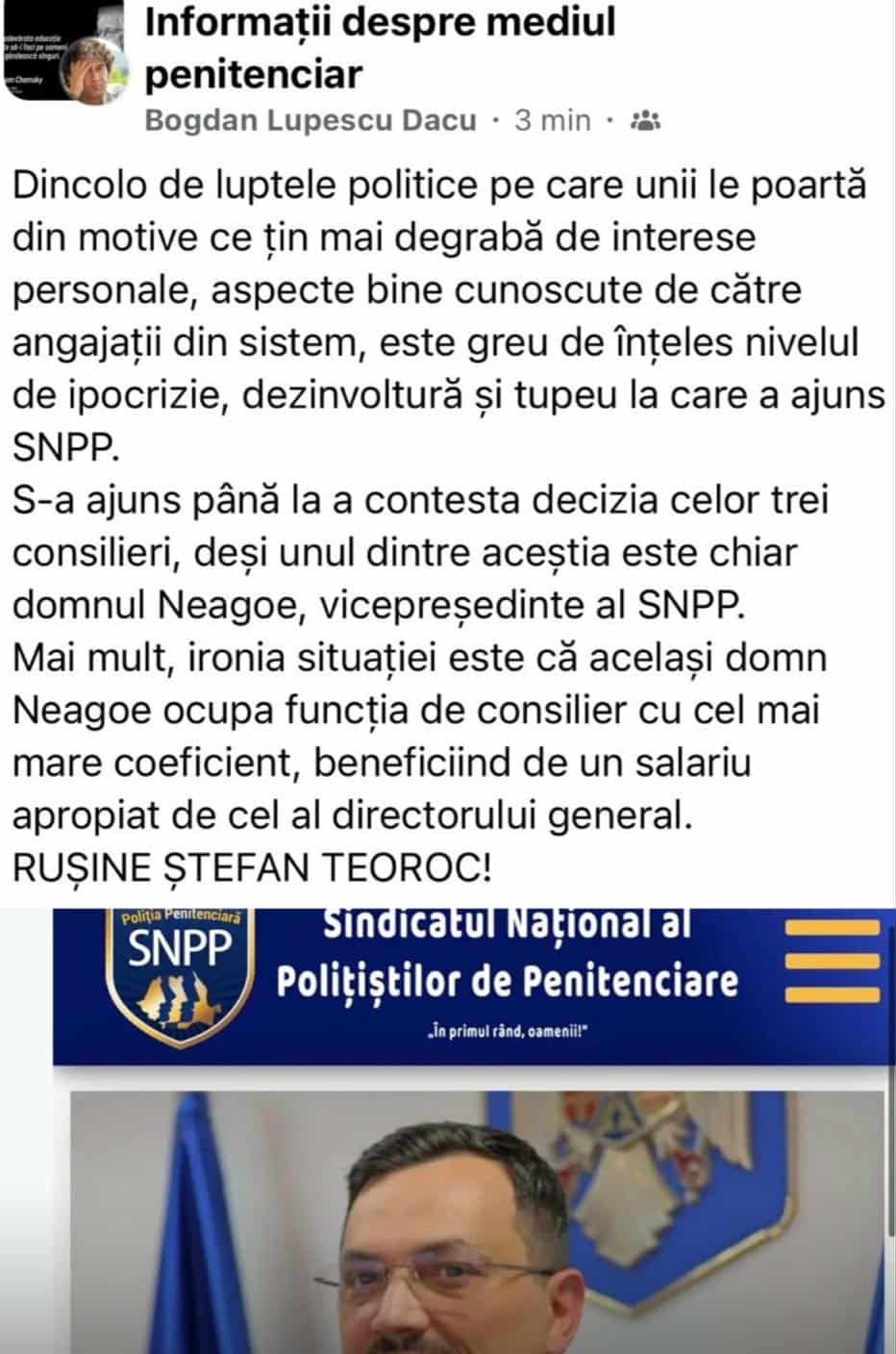 În timp ce Sindicatul Național al Polițiștilor de Penitenciare (SNPP) plânge public că directorul general Burcu „risipește bugetul” cu numirea unui consilier, aflăm că realitatea este alta: posturile de consilieri sunt prevăzute în statul de funcții al ANP. Și, culmea ironiei, cel mai mare coeficient de salarizare dintre consilieri îl avea chiar consilierul SNPP, domnul Adrian Neagoe, vicepreședinte de sindicat, devenit consilier personal al directorului general, dar despre care SNPP nu pomenește nimic. Sursele spun că numirea a fost cerută chiar de Adrian Neagoe pentru „baza de calcul la pensie”.