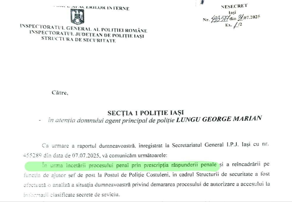 Deși cauza penală în care acesta fusese vizat a încetat prin prescripția răspunderii penale, conducerea IPJ Iași a refuzat „în mod inexplicabil” reluarea procedurii de autorizare a accesului la informații clasificate.