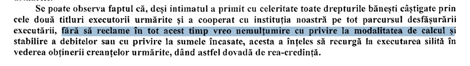 „Se poate observa faptul că, deși intimatul a primit cu celeritate toate drepturile bănești câștigate prin cele două titluri executorii urmărite și a cooperat cu instituția noastră pe tot parcursul desfășurării executării, fără să reclame în tot acest timp vreo nemulțumire… acesta a înțeles să recurgă la executarea silită… dând astfel dovadă de rea-credință.”