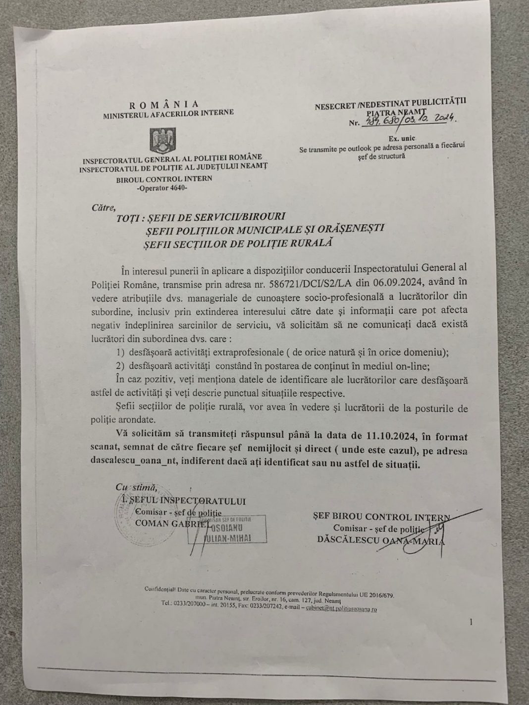 Acest val de spionită generalizată a fost declanșat, conform Sindicatului Diamantul, de Dispoziția 586721/DCI/S2/LA din 06.09.2024, un document semnat de șeful IGPR, Benone Matei, și „confecționat” cu măiestrie la Direcția Control Intern, sub bagheta aceluiași Ionica Iulian. O adevărată capodoperă a intruziunii abuzive! Că la IPJ Neamț și IPJ Botoșani au existat „interceptări audio ilegale” e doar vârful aisbergului unui fenomen pe care Sindicatul Diamantul îl pune pe seama lui Benone Matei și a DCI, cu posibila „binecuvântare prealabilă” a secretarului de stat Despescu. Mai multă transparență, mai puțină putere coruptă? Nu și în MAI, unde se preferă întunericul subteranului!