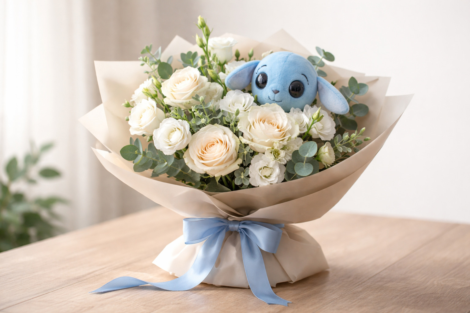Dacă vrei să nu încarci, dimensiunea e primul lucru pe care îl controlezi. Un pluș mare, oricât de simpatic, va domina tot. Asta poate fi intenția, dar atunci buchetul nu mai e clasic, e un cadou mixt, jumătate flori, jumătate jucărie.