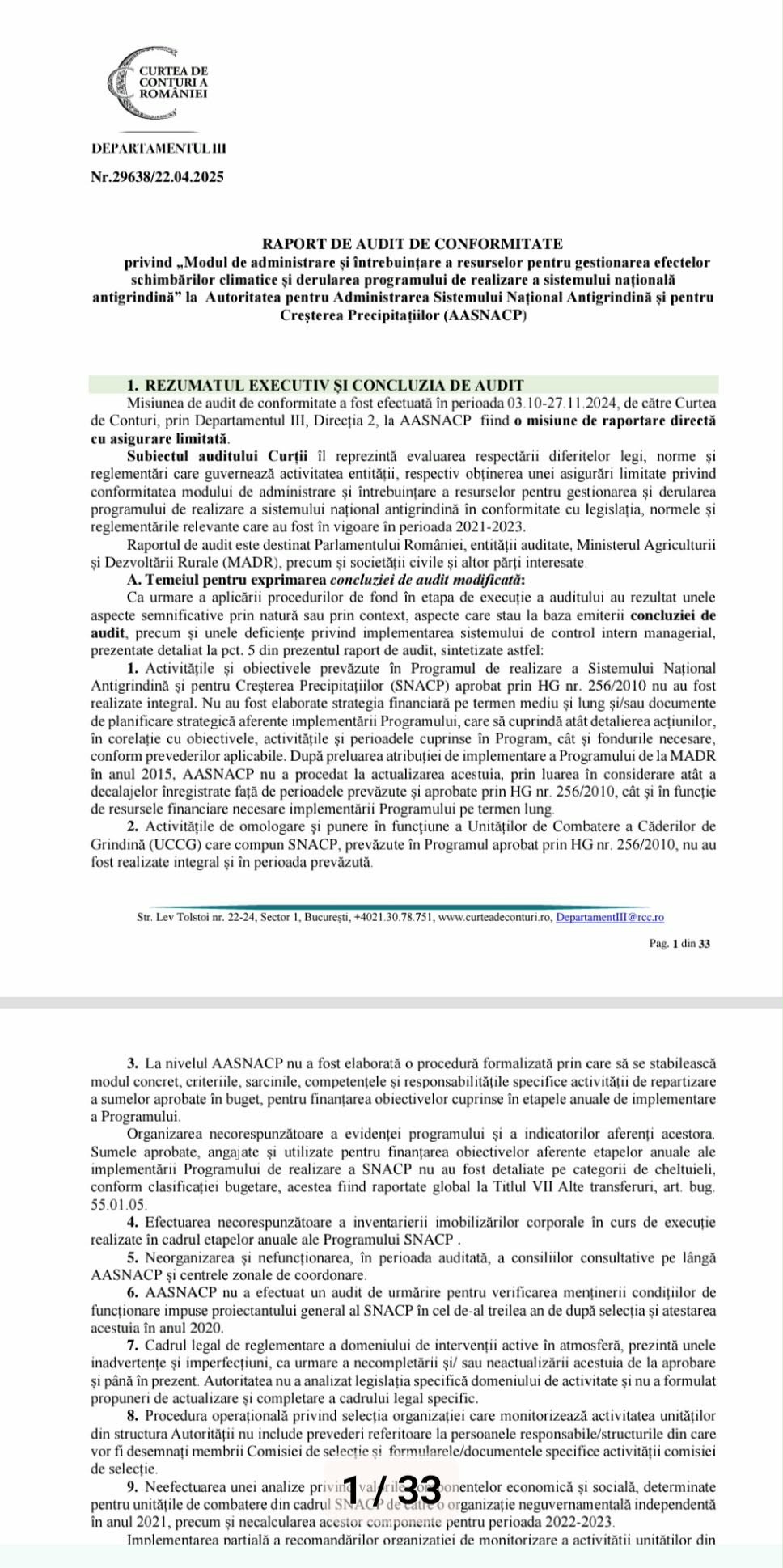 Misiunea de audit a Curții de Conturi, desfășurată între 03.10 și 27.11.2024, a analizat activitatea AASNACP în perioada 2021-2023. Verdictul oficial? O „Concluzie cu rezerve”. Pe românește, înseamnă că sistemul este atât de putred, încât chiar și limbajul birocratic a trebuit să recunoască dezastrul. S-a constatat că Programul de realizare a SNACP, aprobat prin HG 256/2010 – acea „biblie a mafiei antigrindină” – nu a fost realizat integral. Mai grav, AASNACP, după ce a preluat atribuțiile în 2015, nu l-a actualizat NICIODATĂ, lăsând țara fără o strategie financiară pe termen mediu și lung.