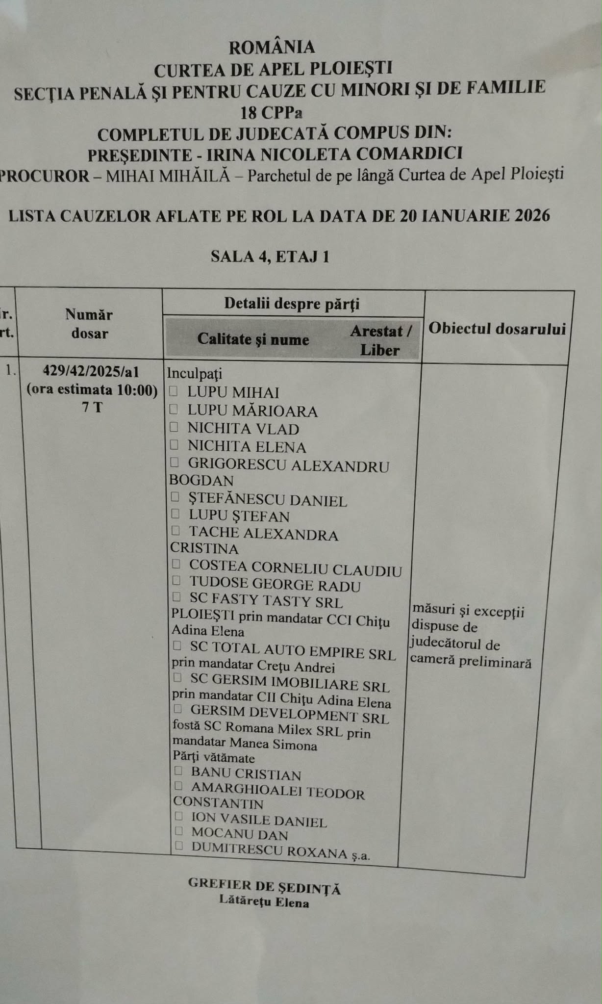 Dosarul de urmărire penală 221/282/P/2023, instrumentat de Parchetul de pe lângă Curtea de Apel Ploiești, a ajuns la Curtea de Apel Ploiești în mai 2025, fiind înregistrat 429/42/2025/a1.