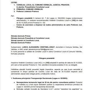 În 2026, consilierul local Luncă Alexandru Cristinel-Ionuț transmite o plângere prealabilă privind nelegalitatea HCL 102, către: