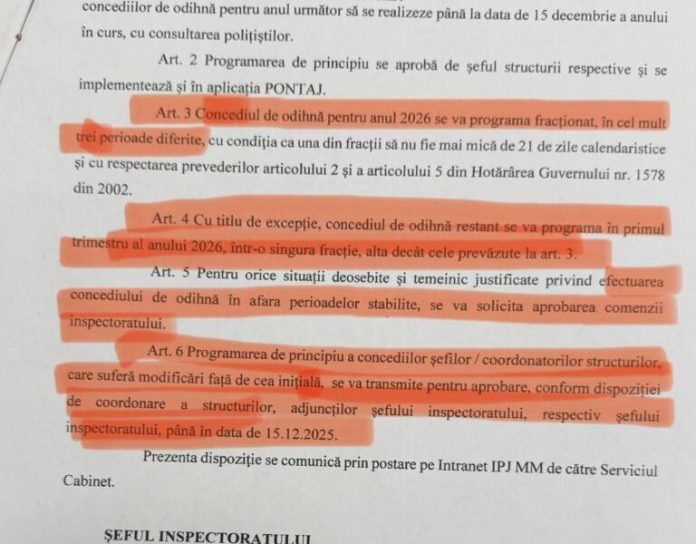 În luna decembrie a anului 2025, șeful Inspectoratului de Poliție al Județului Maramureș a emis o dispoziție care impunea o serie de modificări substanțiale privind programarea și efectuarea concediilor de odihnă pentru anul 2026. Printre cele mai controversate măsuri se numărau: limitarea fracționării concediului la maximum trei perioade, restrângerea acordării concediului restant la primul trimestru al anului următor și condiționarea efectuării concediului în afara perioadelor stabilite de o aprobare explicită din partea conducerii inspectoratului.