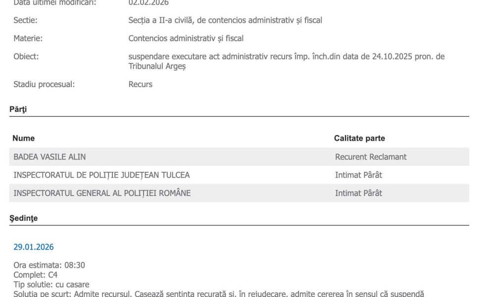 Însă, ceea ce la Tribunal a fost considerat un caz neîntemeiat, a căpătat o turnură diferită la instanța superioară. Reclamantul a obținut câștig de cauză la Curtea de Apel Pitești, care a dispus suspendarea efectelor destituirii disciplinare, validând astfel, cel puțin parțial, criticile de nelegalitate invocate.