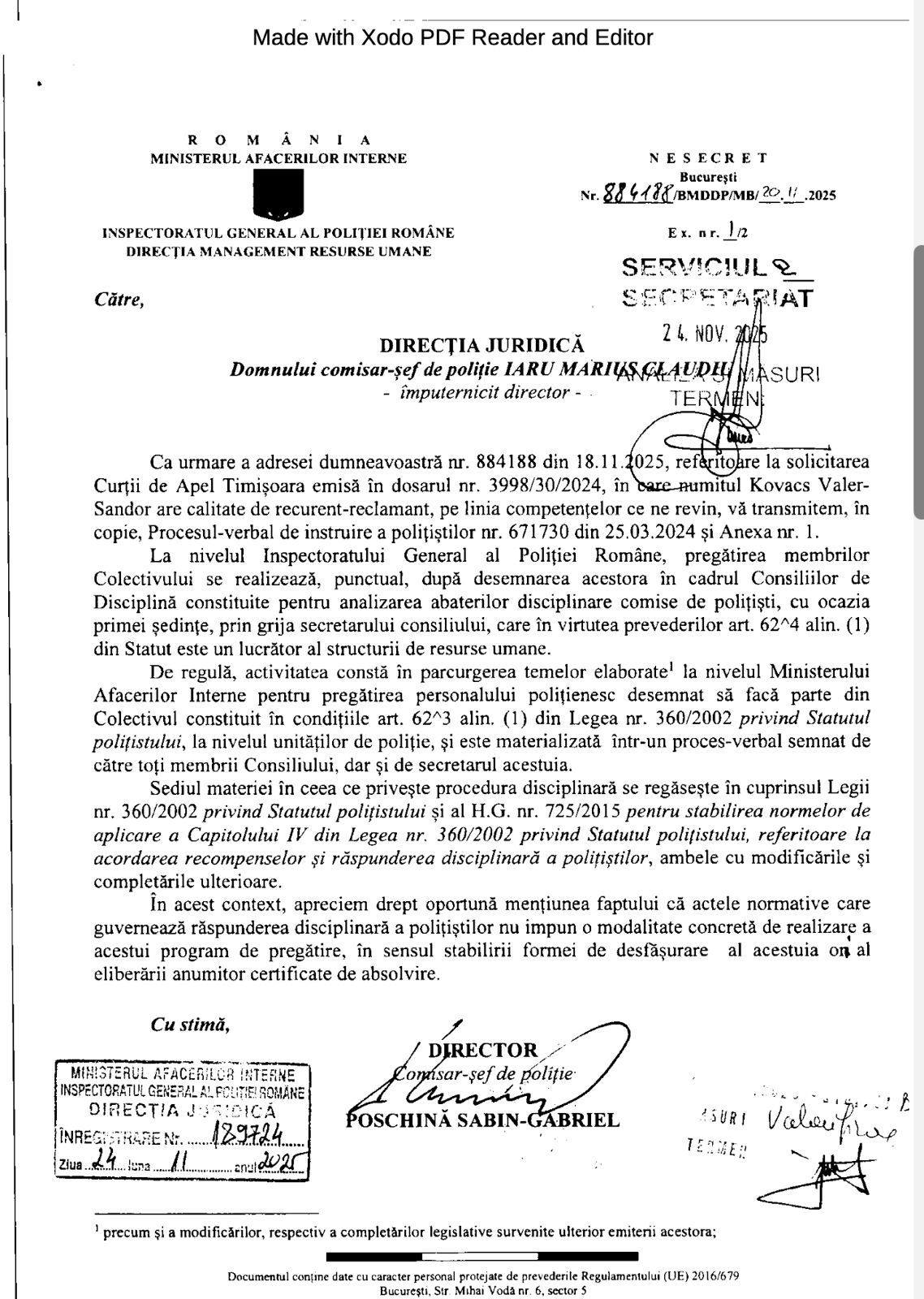 Relevanța acestei decizii este amplificată de un răspuns oficial din partea Inspectoratului General al Poliției Române (IGPR), depus în dosarul lui Valter Kovacs (nr. 3998/30/2024), care, conform Sindicatului Diamantul, ar putea servi drept argument solid în procese similare. Așteptăm cu interes redactarea motivării soluției Curții de Apel, care va oferi detalii juridice complete și va clarifica amploarea precedentului stabilit pentru viitoarele proceduri disciplinare din cadrul MAI. (Cristina T.).