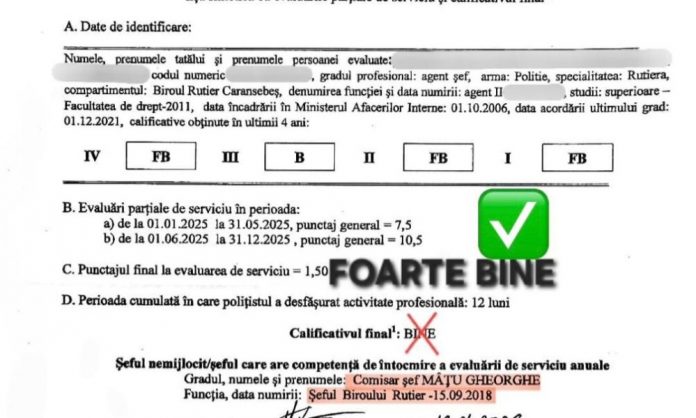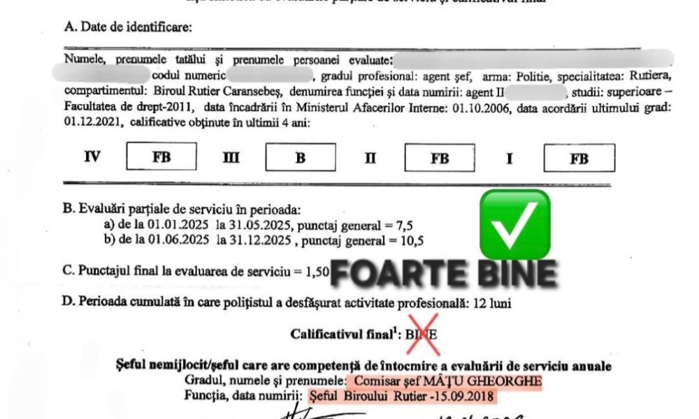 Imaginați-vă scena: un polițist, cu o activitate profesională atât de „solidă” încât probabil ar putea sparge gheața indiferenței manageriale, este gratulat cu un calificativ de „BINE”. Nu „FOARTE BINE”, nu „EXCELENT”, ci un modest și demotivant „BINE”. Cine semnează această capodoperă de subevaluare? Chiar „Șeful Biroului Rutier Caransebeș”, un vizionar, se pare, al mediocrității impuse!